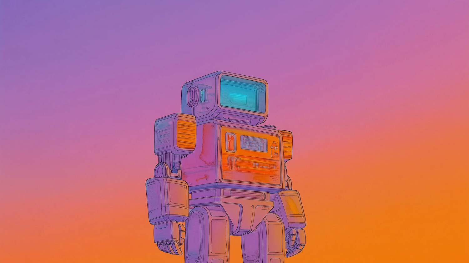 Retro robot with a boxy design against a vibrant purple to orange gradient background, evoking 1980s sci-fi nostalgia.