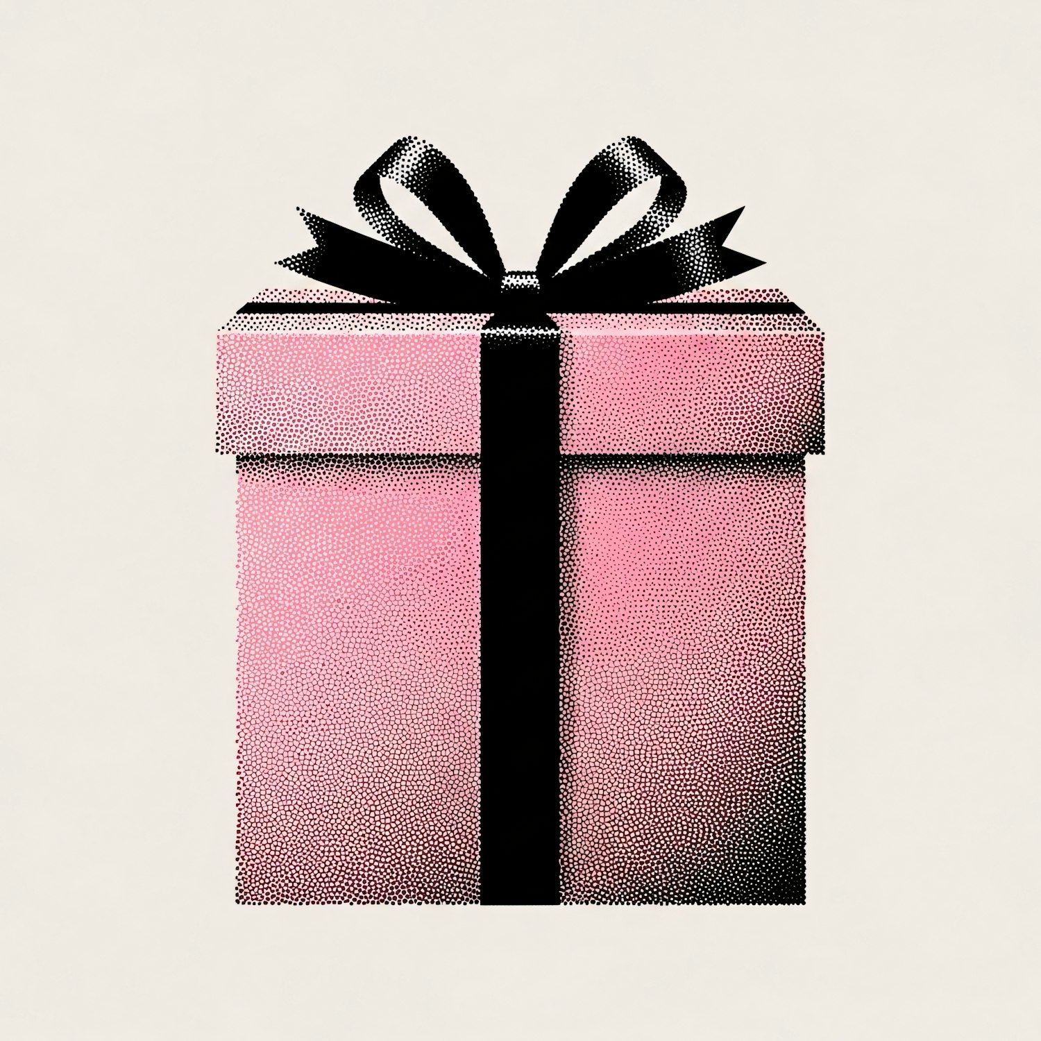 A pink gift box with a black ribbon and bow, designed in a halftone dot style for a vintage look.
