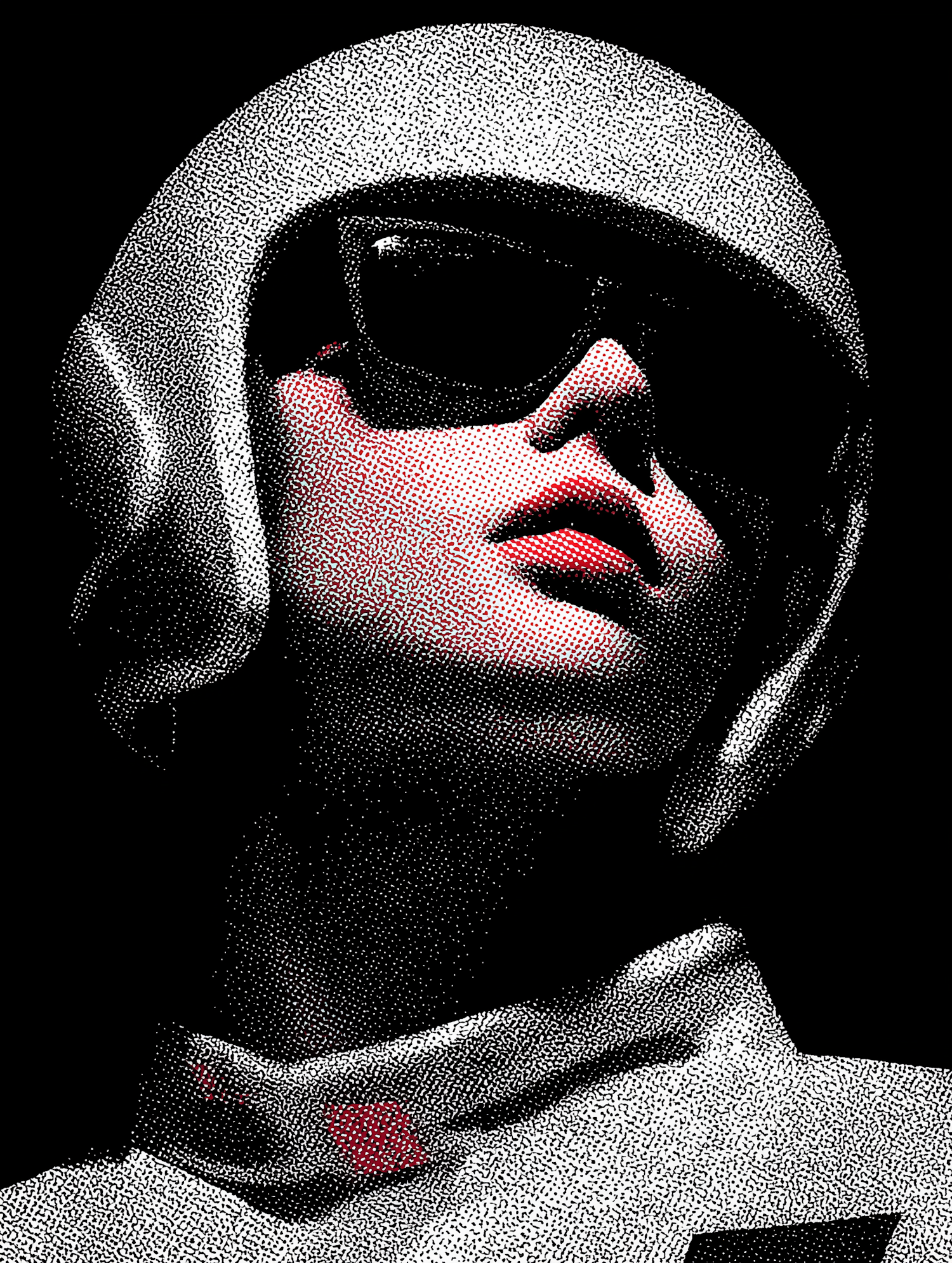 Stylized halftone illustration of a person in a white helmet and sunglasses, with bold contrasts and a retro aesthetic.
