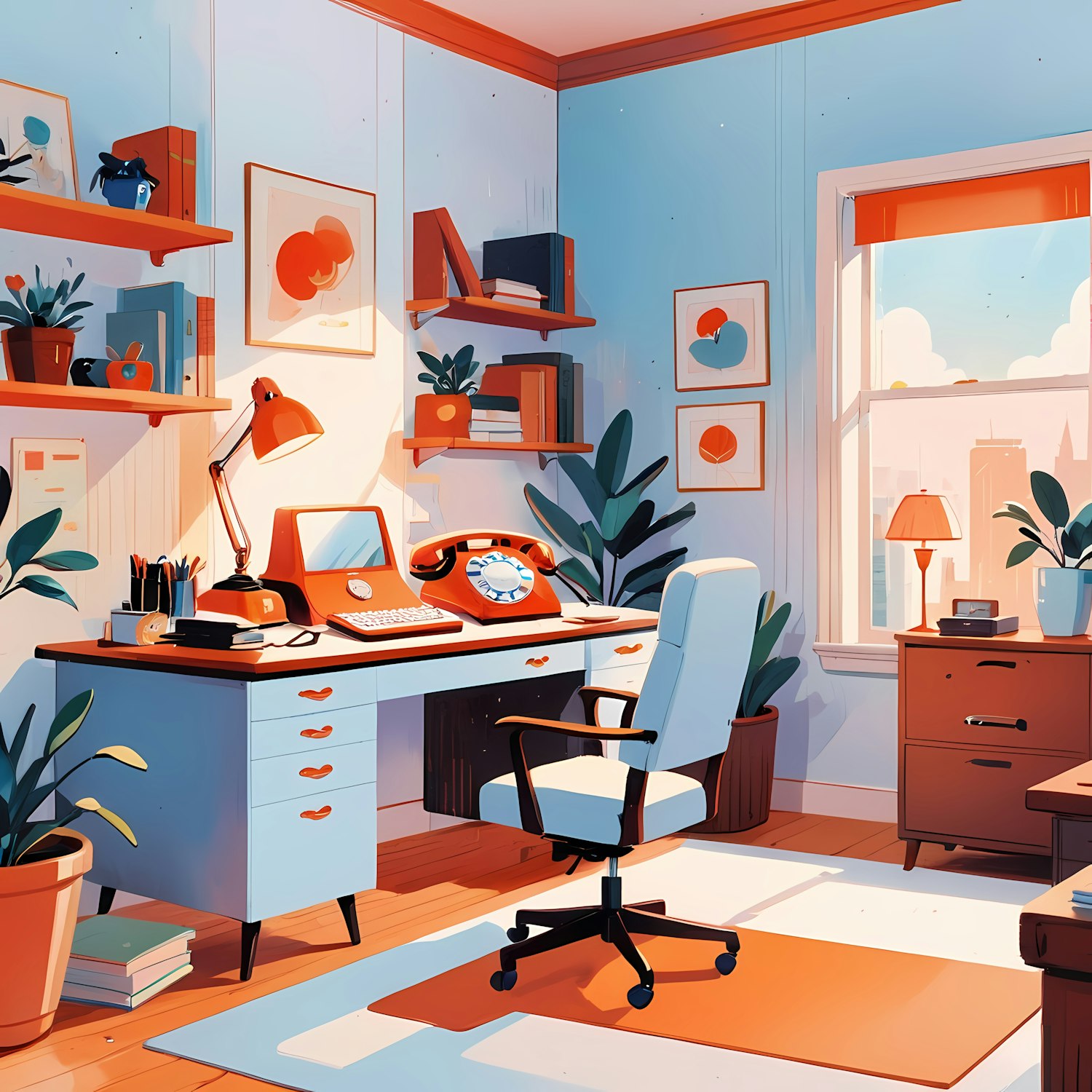 Retro-inspired home office with a vintage rotary phone, retro computer, and vibrant orange and blue decor. Perfect cozy workspace vibes.