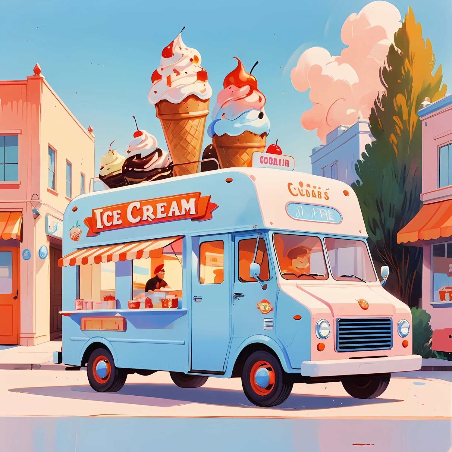 Whimsical retro ice cream truck with giant cones on top, pastel colors, and a sunny street setting. Perfect summer vibes!