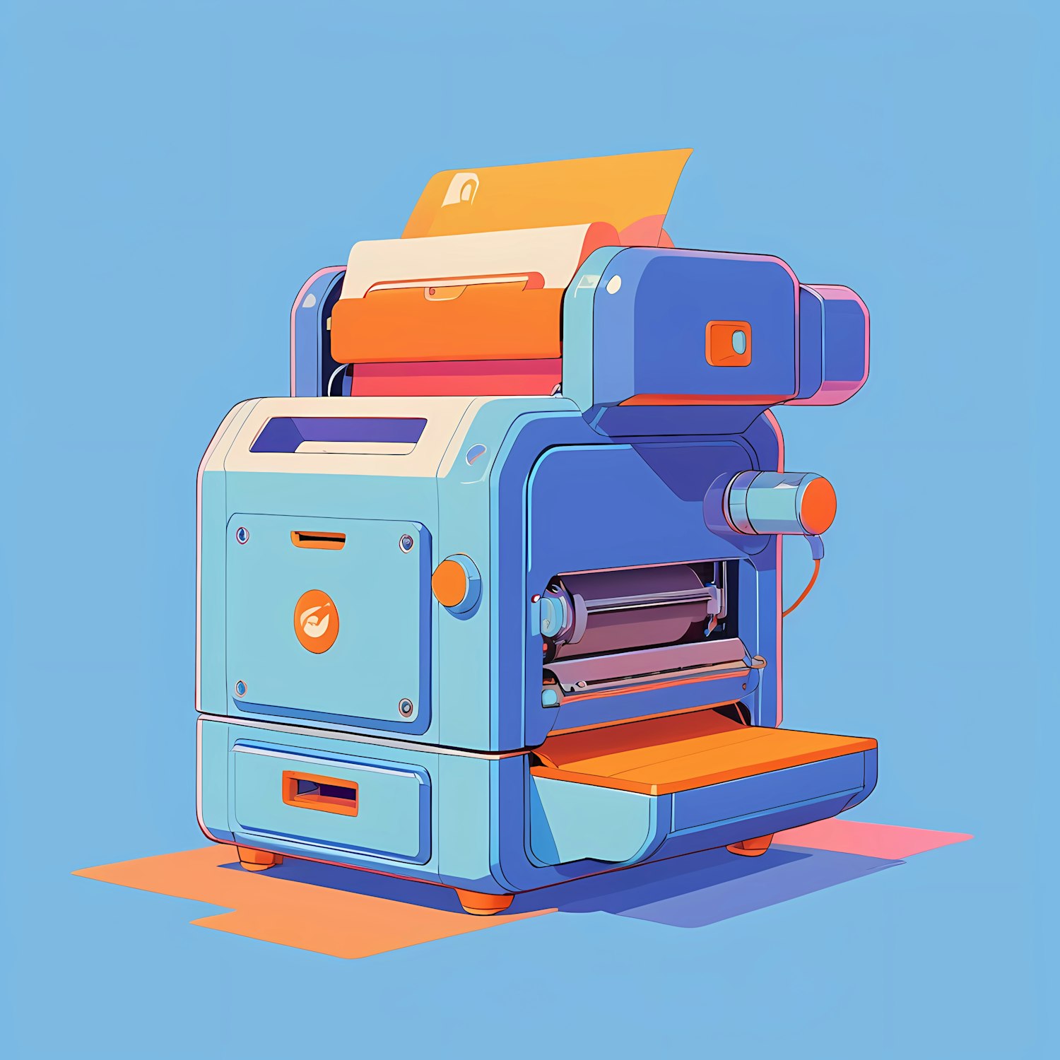 Vibrant retro-styled printer illustration with bright colors and playful design, set against a solid blue background.