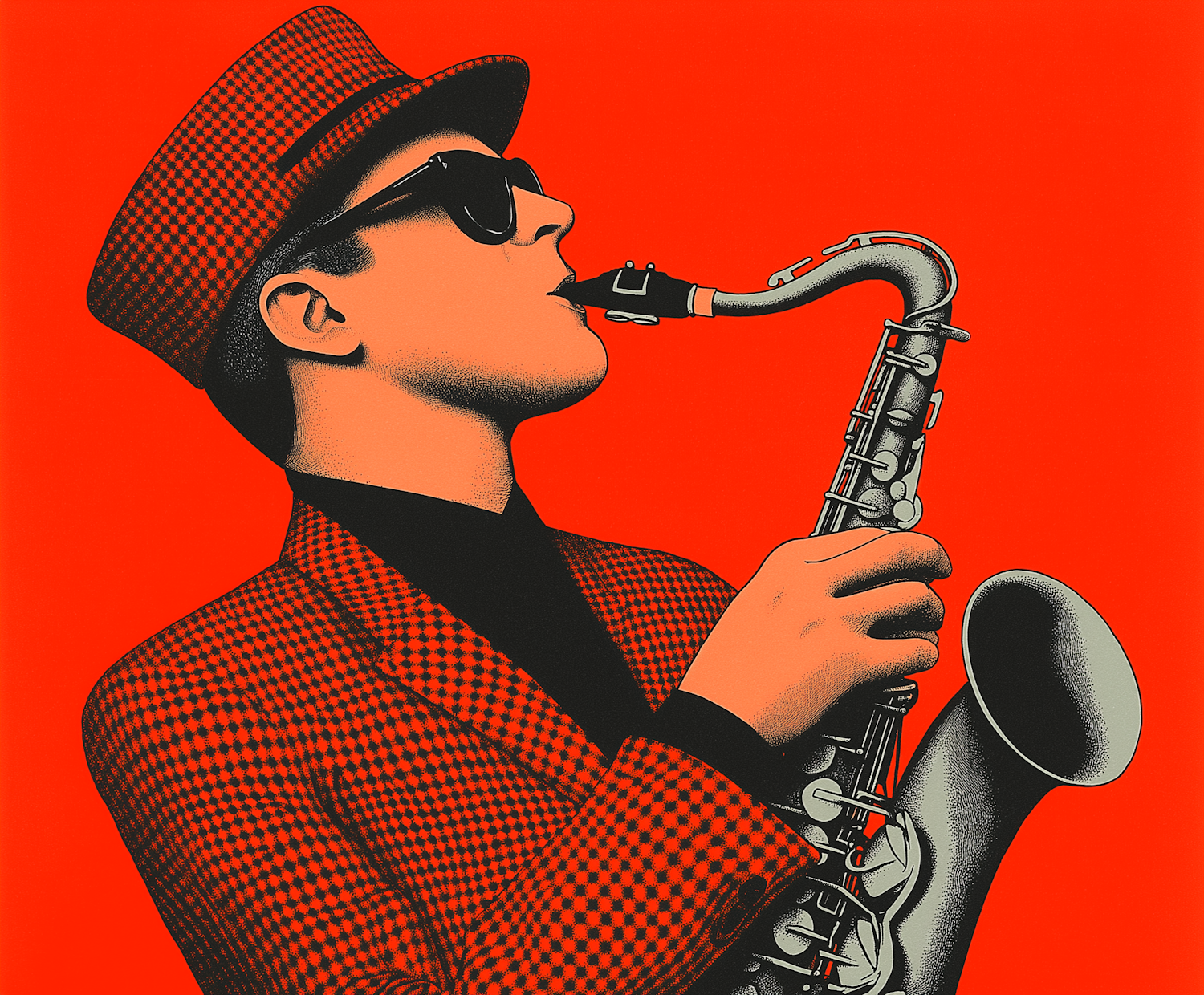Stylish illustration of a musician in a red checkered suit playing a saxophone against a bold red background.