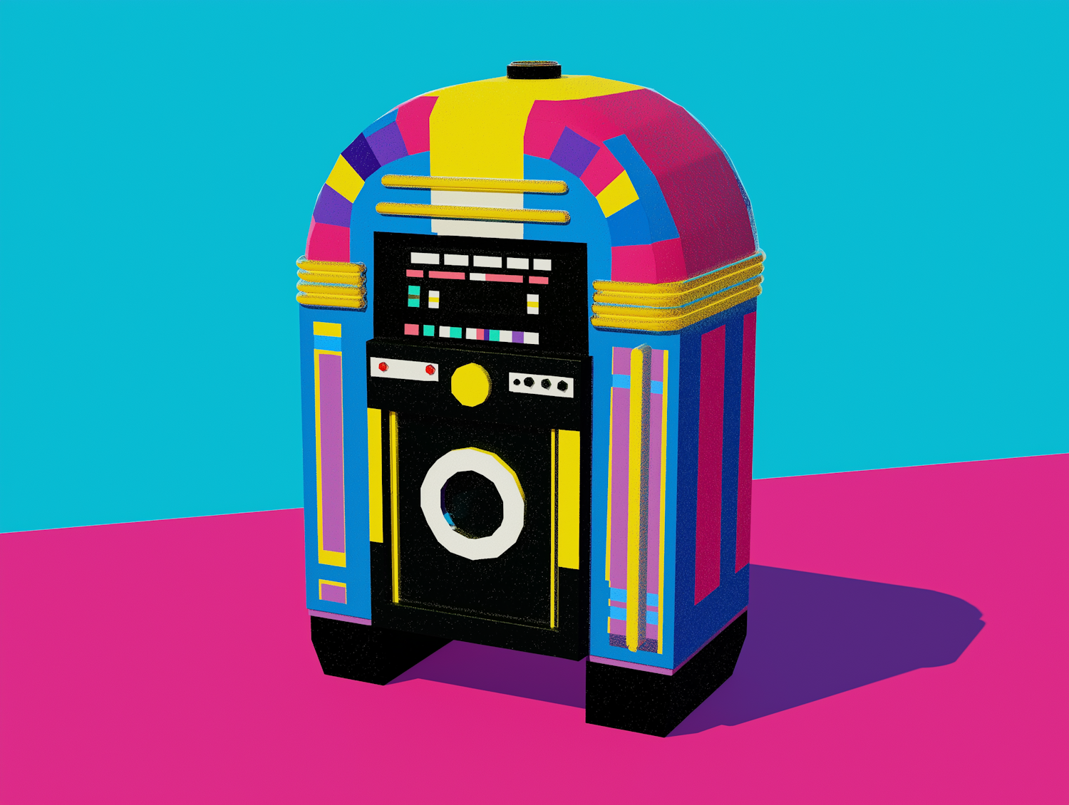 Colorful retro jukebox on a vibrant turquoise and magenta background, showcasing a pop-art style with bold geometric patterns.