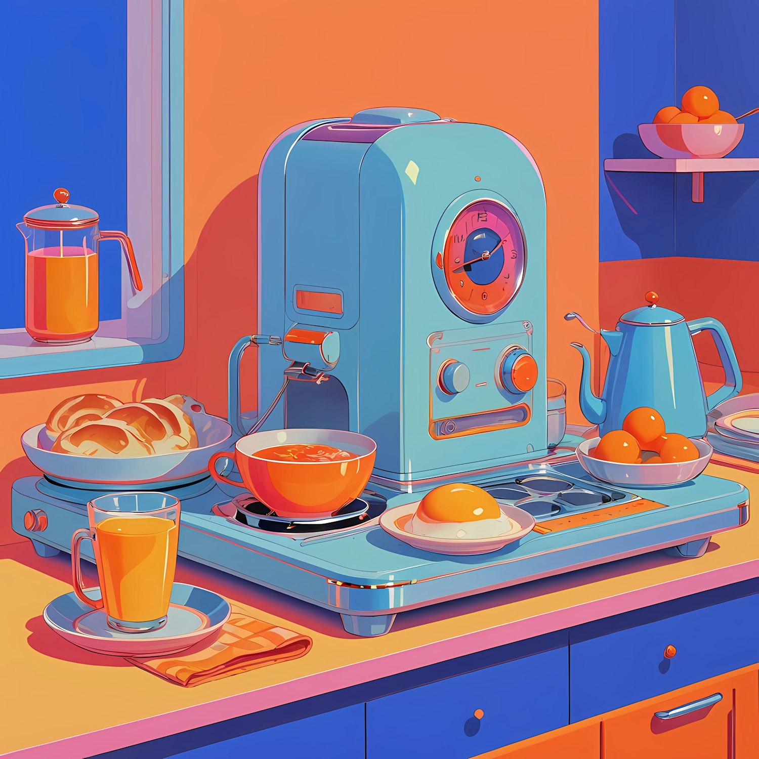 Retro kitchen scene with a turquoise coffee machine, breakfast items, and vibrant orange and blue colors.