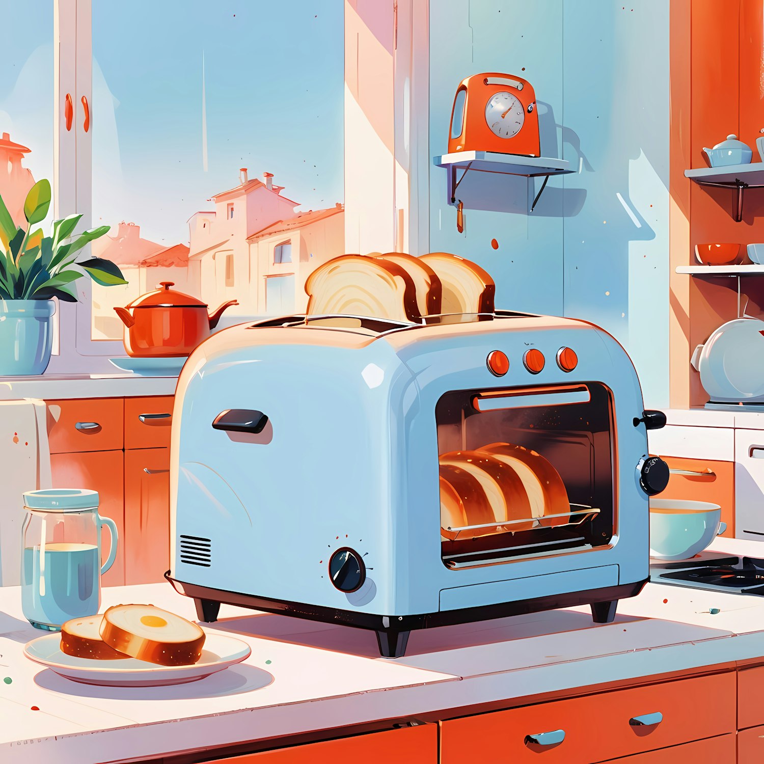 Retro kitchen with a pastel blue toaster oven, toasted bread, and warm orange accents. Bright sunlight and vintage decor complete the cozy vibe.