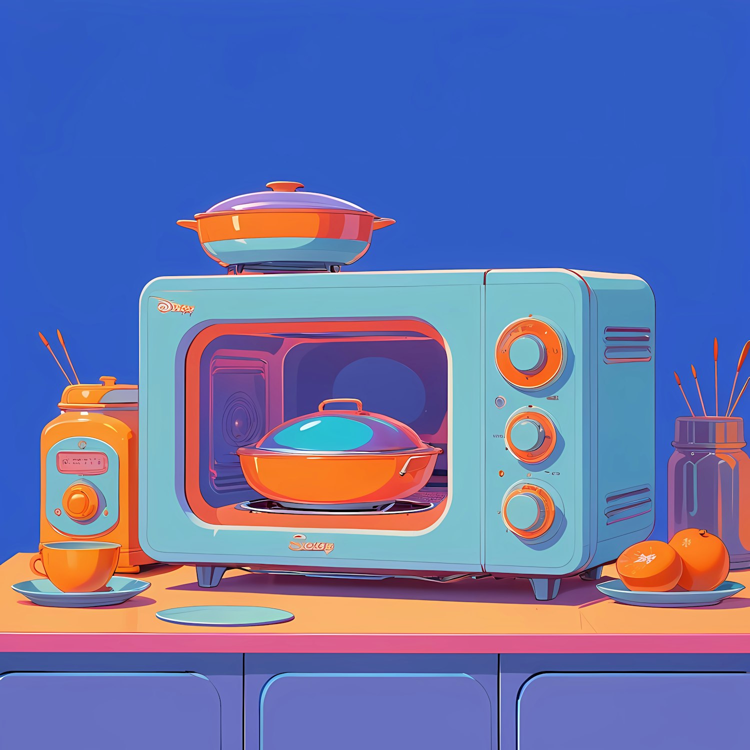 Colorful retro kitchen illustration with a turquoise microwave, orange accents, and artistic elements like paintbrushes and oranges.