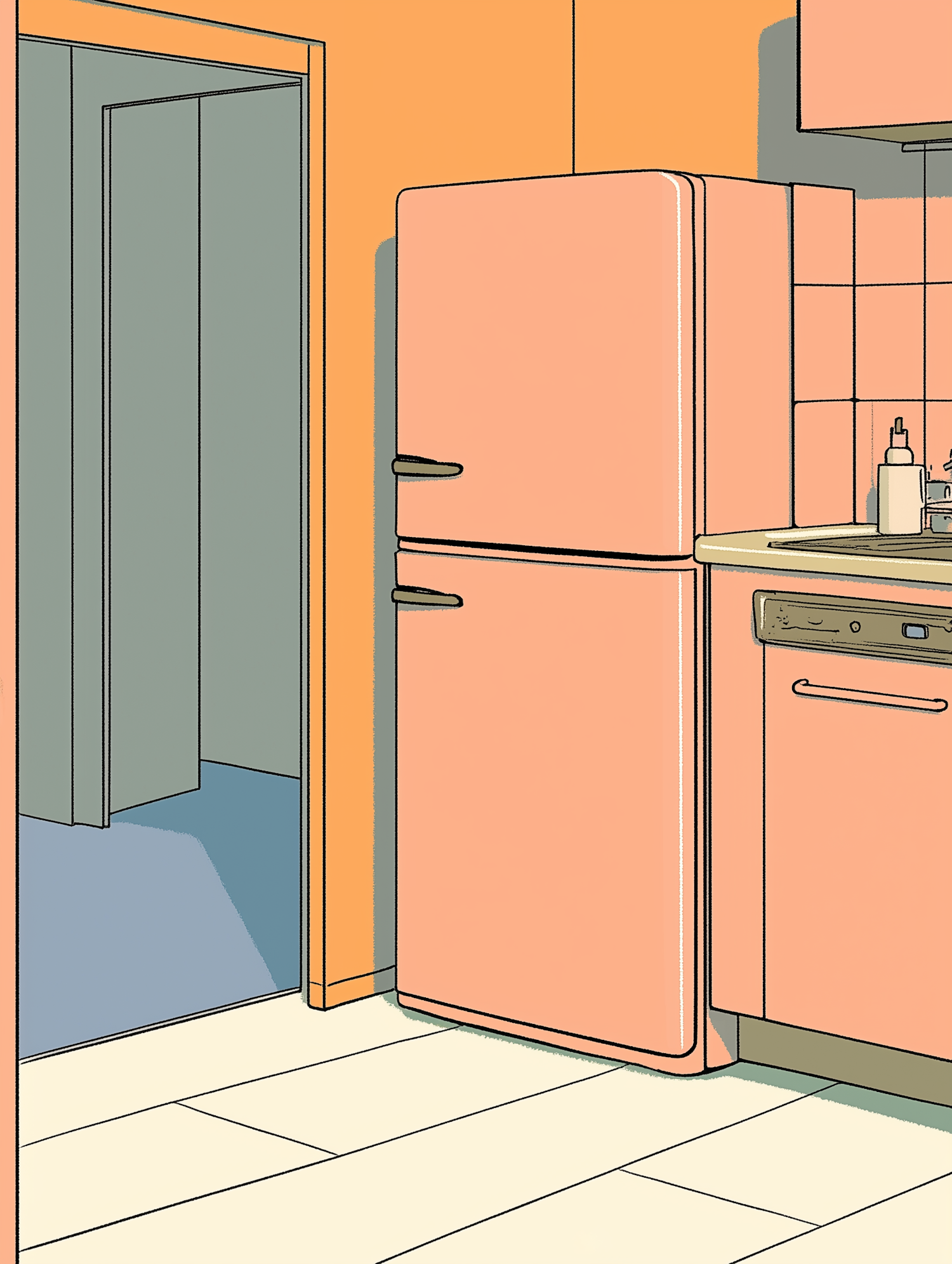 Retro kitchen illustration with pastel pink fridge, orange walls, and light flooring. Cozy and nostalgic vibe with a vintage aesthetic.