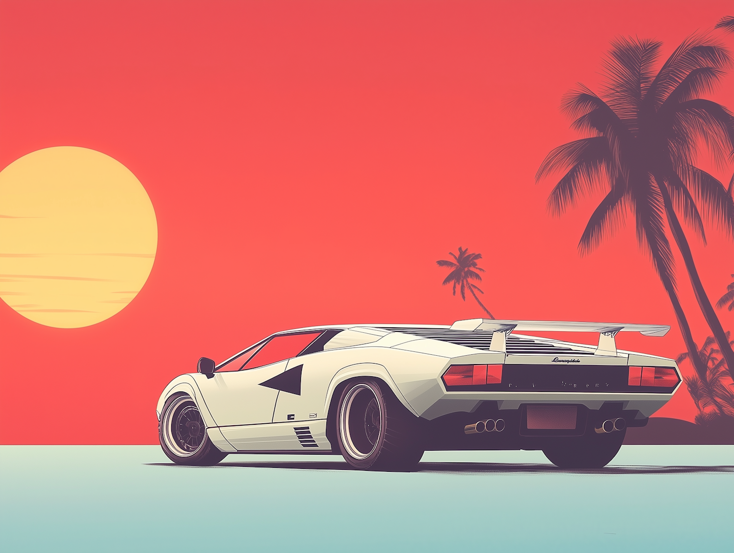 Retro illustration of a white Lamborghini Countach with a sunset, palm trees, and 80s tropical vibes. Perfect for car and vintage art lovers.
