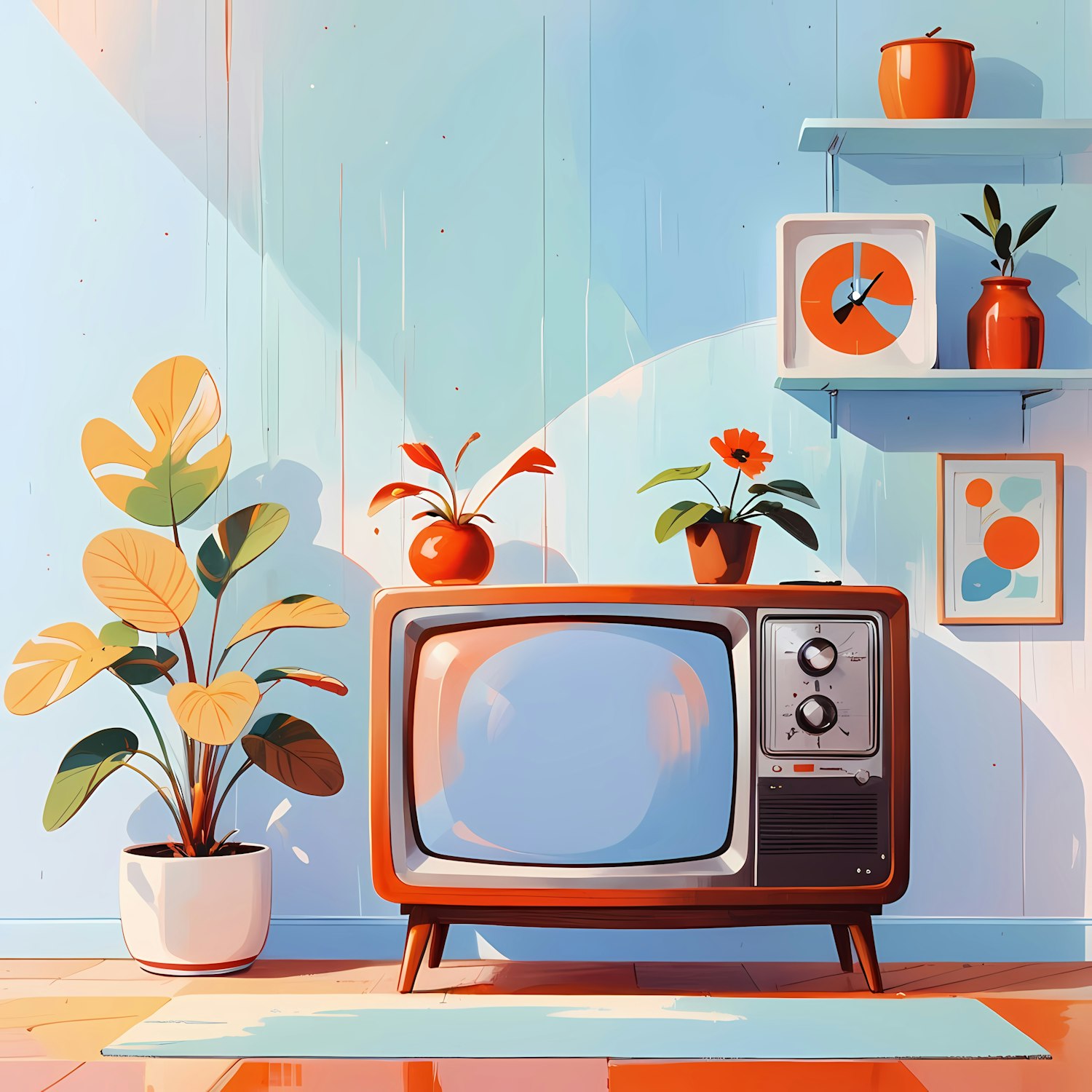 Retro living room with a vintage TV, potted plants, and colorful decor on a light blue wall. Perfect mix of nostalgia and modern design.
