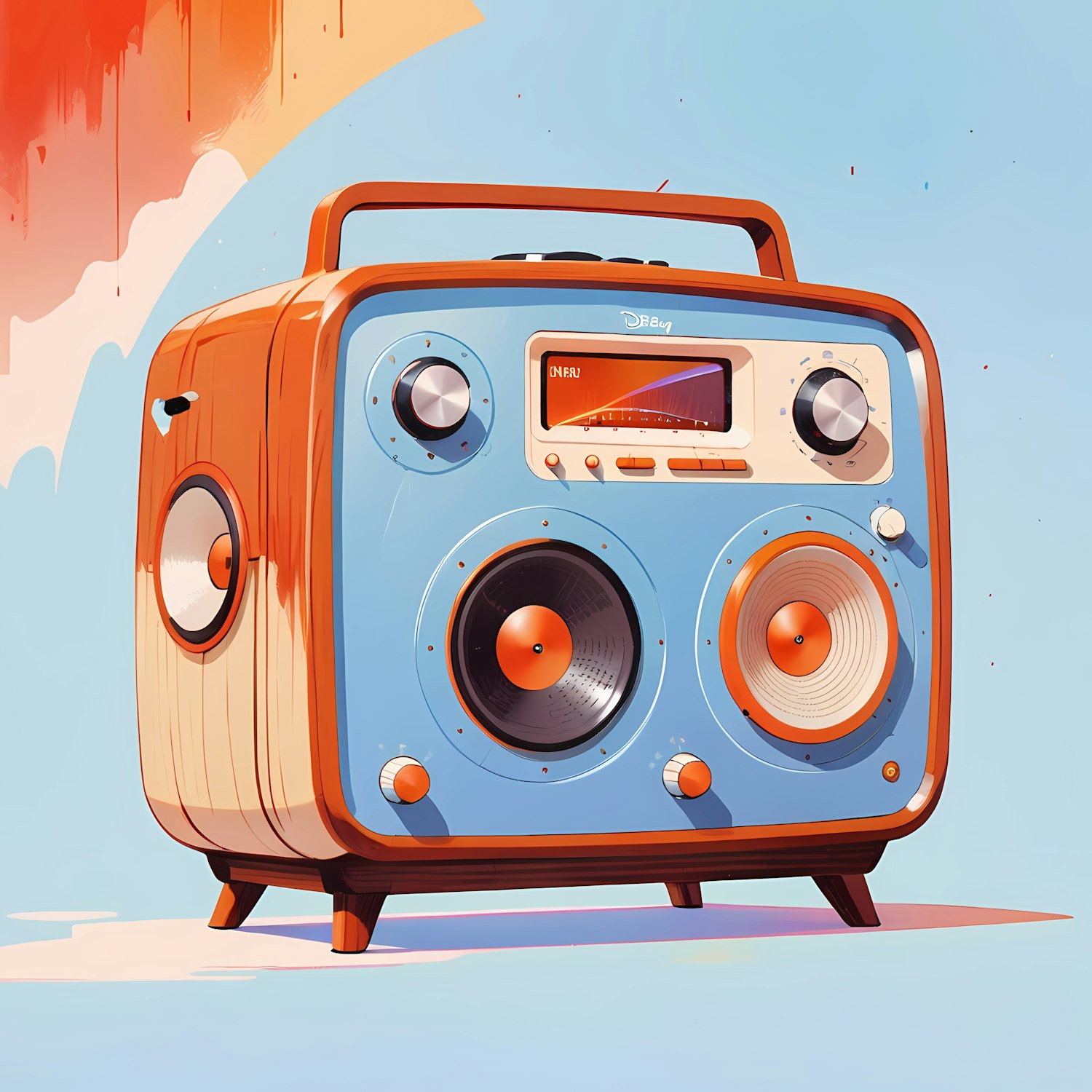 Stylish retro radio illustration with blue and orange tones, vinyl-inspired speakers, and a modern control panel. Perfect for vintage lovers!