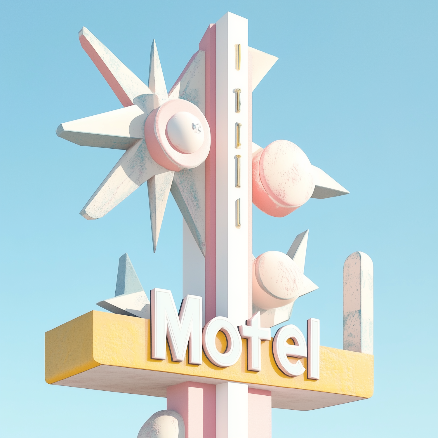 Retro motel sign with pastel pink, yellow, and white tones, featuring starburst shapes and bold 3D lettering against a clear blue sky.