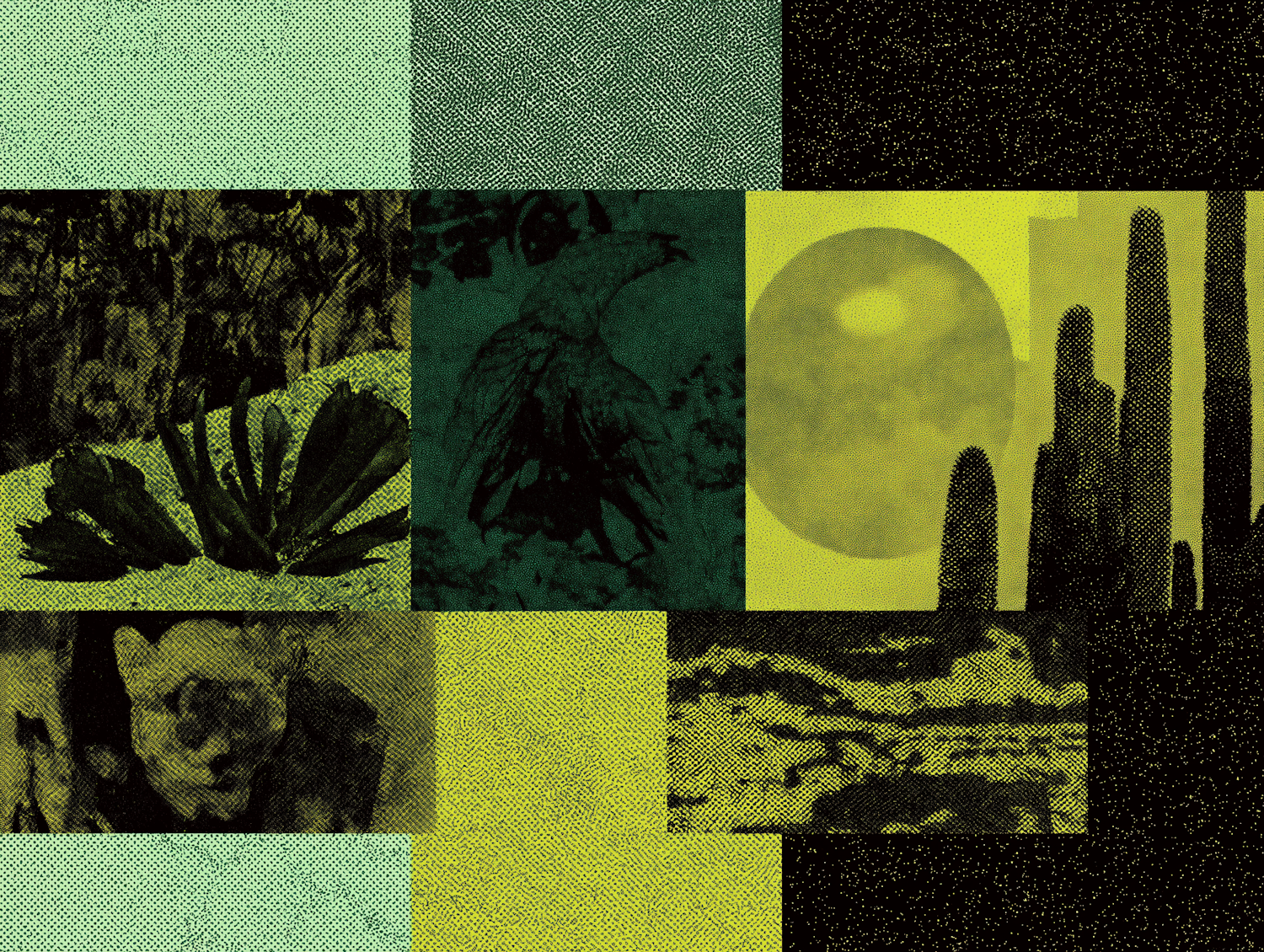 Retro-style collage with green, yellow, and black textures featuring a bird, cacti, desert plants, and abstract patterns.