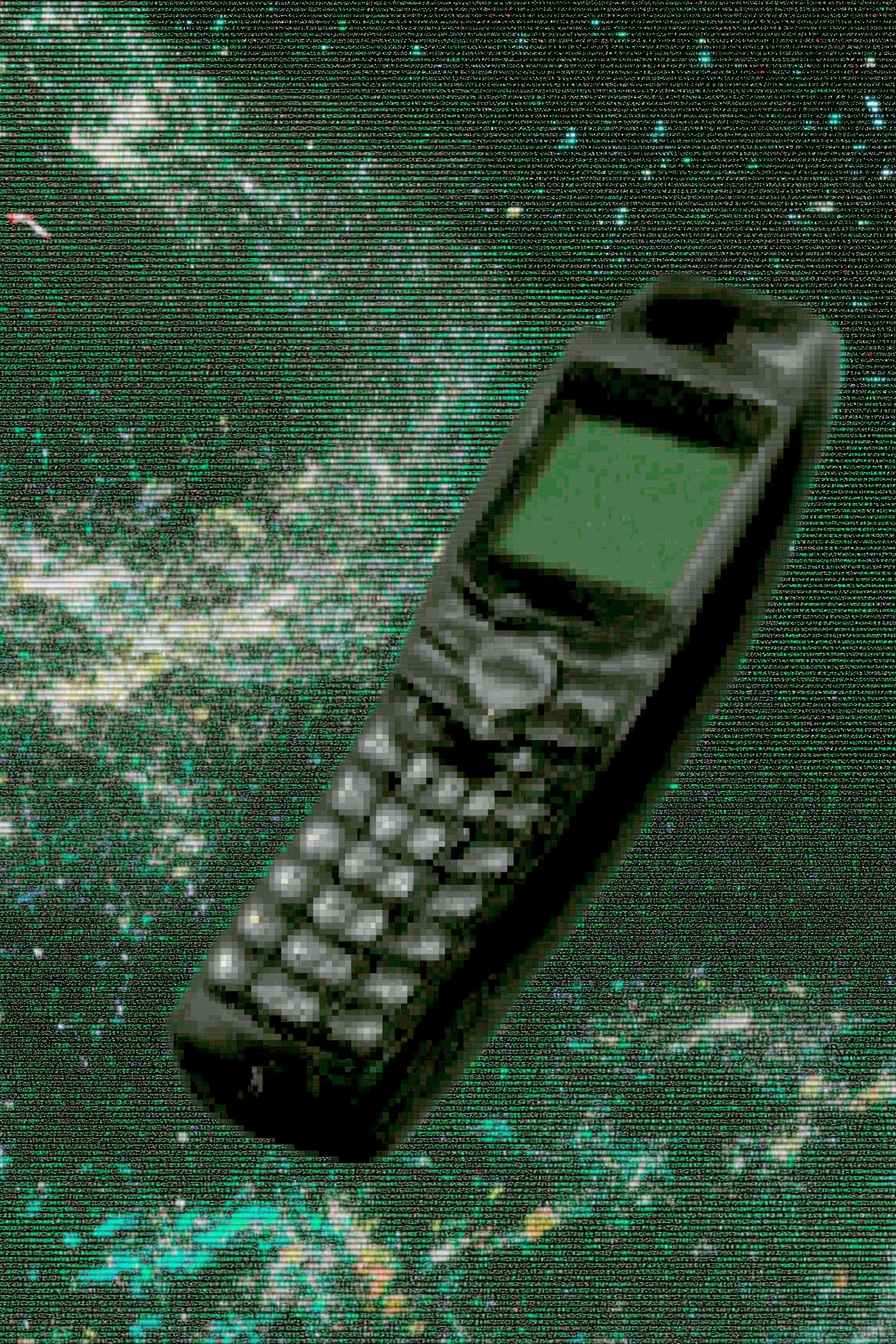 Pixelated retro mobile phone with a green screen against a cosmic, starry background. A nostalgic and futuristic digital art piece.
