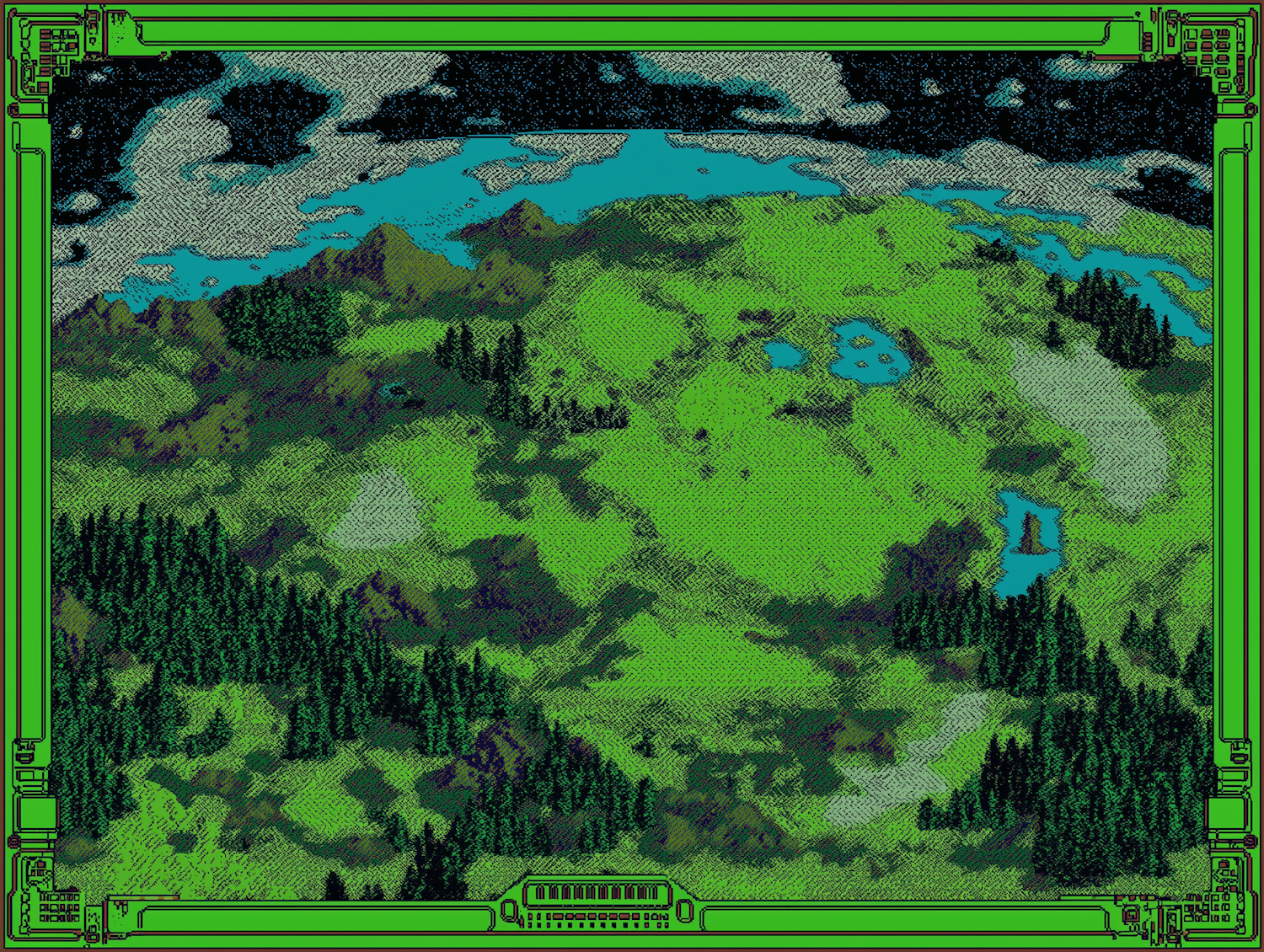 Retro pixel art landscape with green hills, forests, and lakes, framed by a vintage computer interface. Nostalgic and vibrant design.