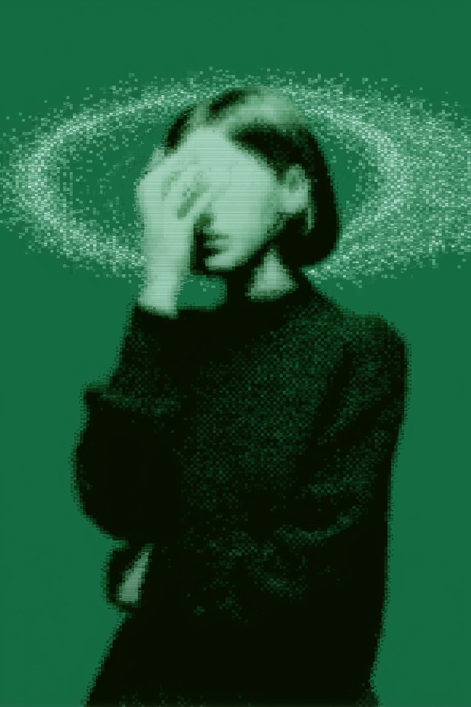 Pixelated green artwork of a person covering their face, surrounded by a halo of white dots, evoking a retro digital aesthetic.