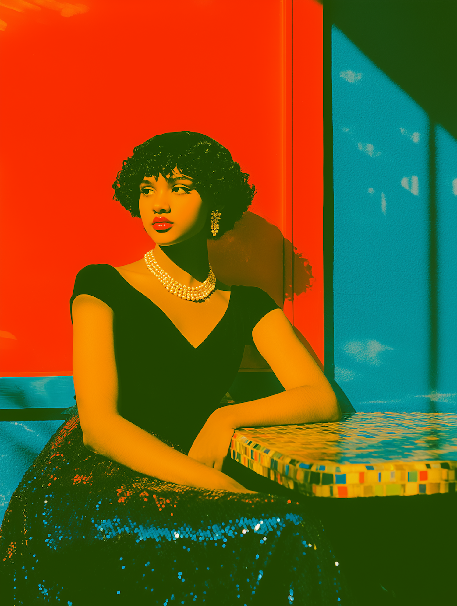 Retro-inspired portrait of a woman in pearls and sequins, set against a bold red and blue background with dramatic lighting.
