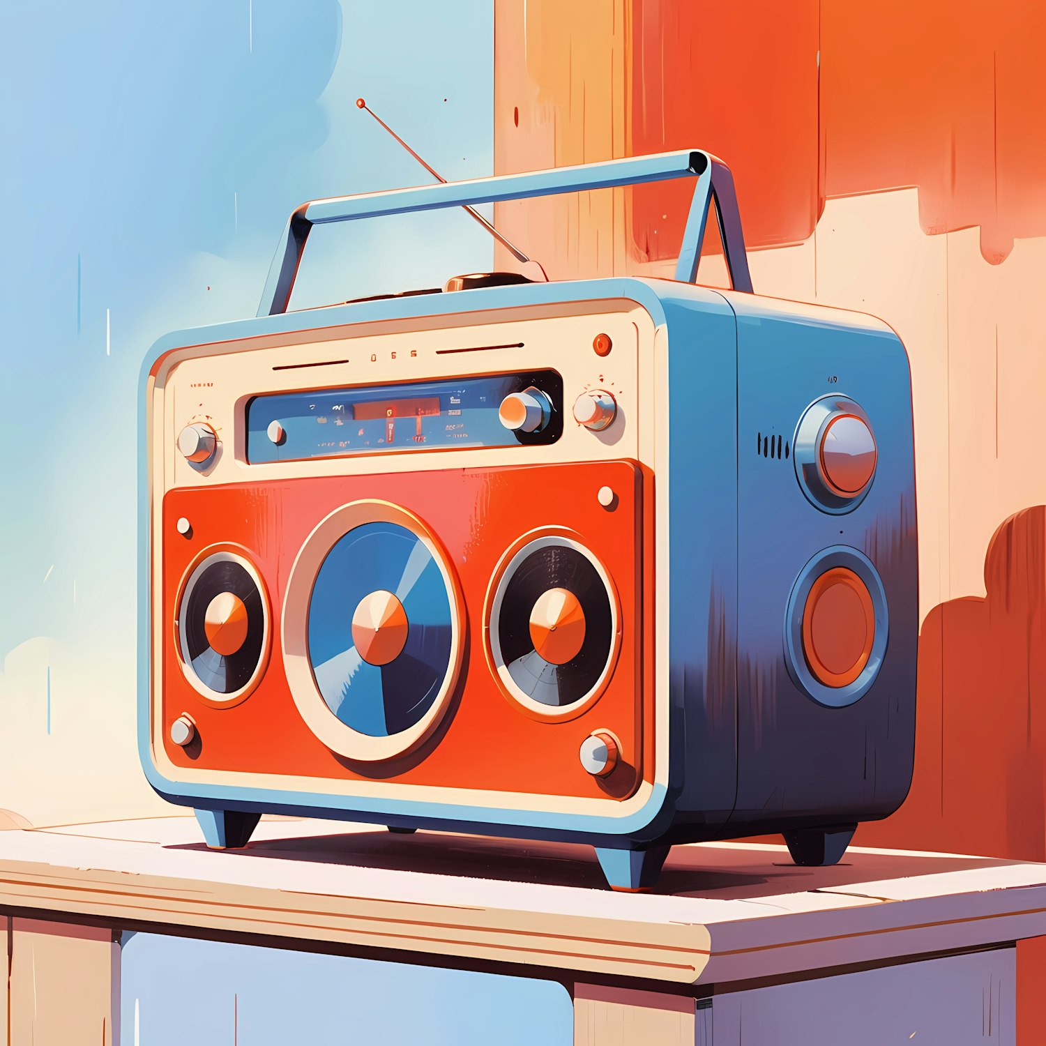 Stylized retro radio with bold orange and blue tones, large speakers, and vintage knobs, set against a warm, sunny background.