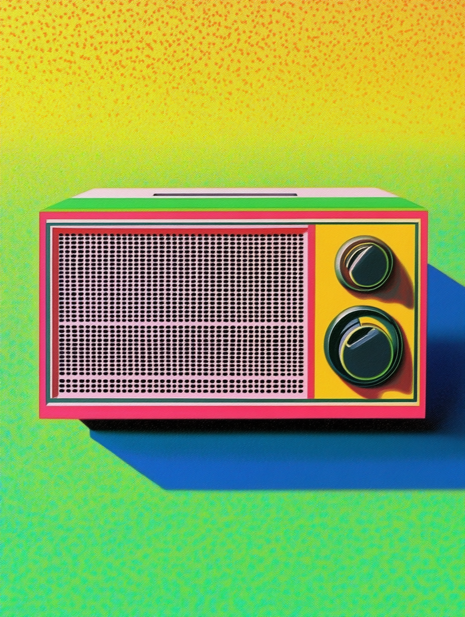 Bright retro radio with pink, yellow, and green design on a gradient yellow-green background. Perfect for vintage and pop-art lovers.