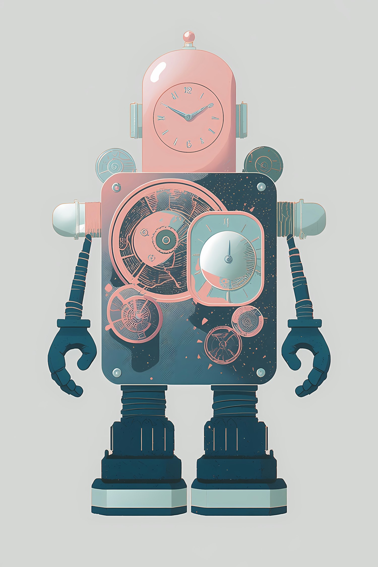 A retro-styled robot illustration with clock and gear details, blending pastel pink and blue tones for a vintage-futuristic look.