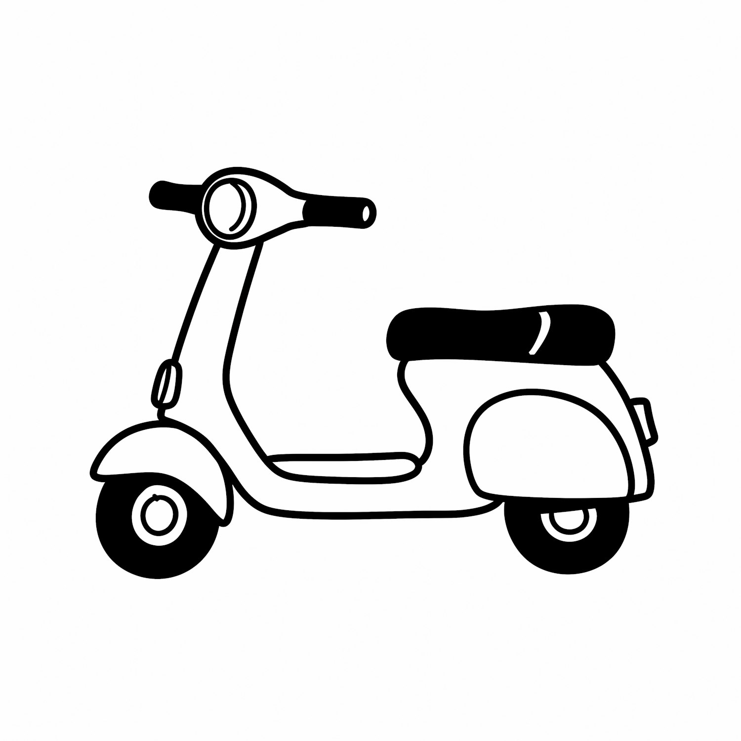 Minimalistic black-and-white illustration of a retro scooter with clean lines and a simple design, perfect for design projects.