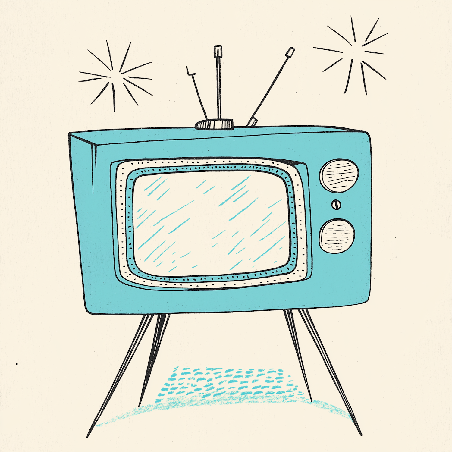 Retro turquoise TV illustration with antennas, dials, and angled legs on a beige background. Minimalistic and nostalgic design.