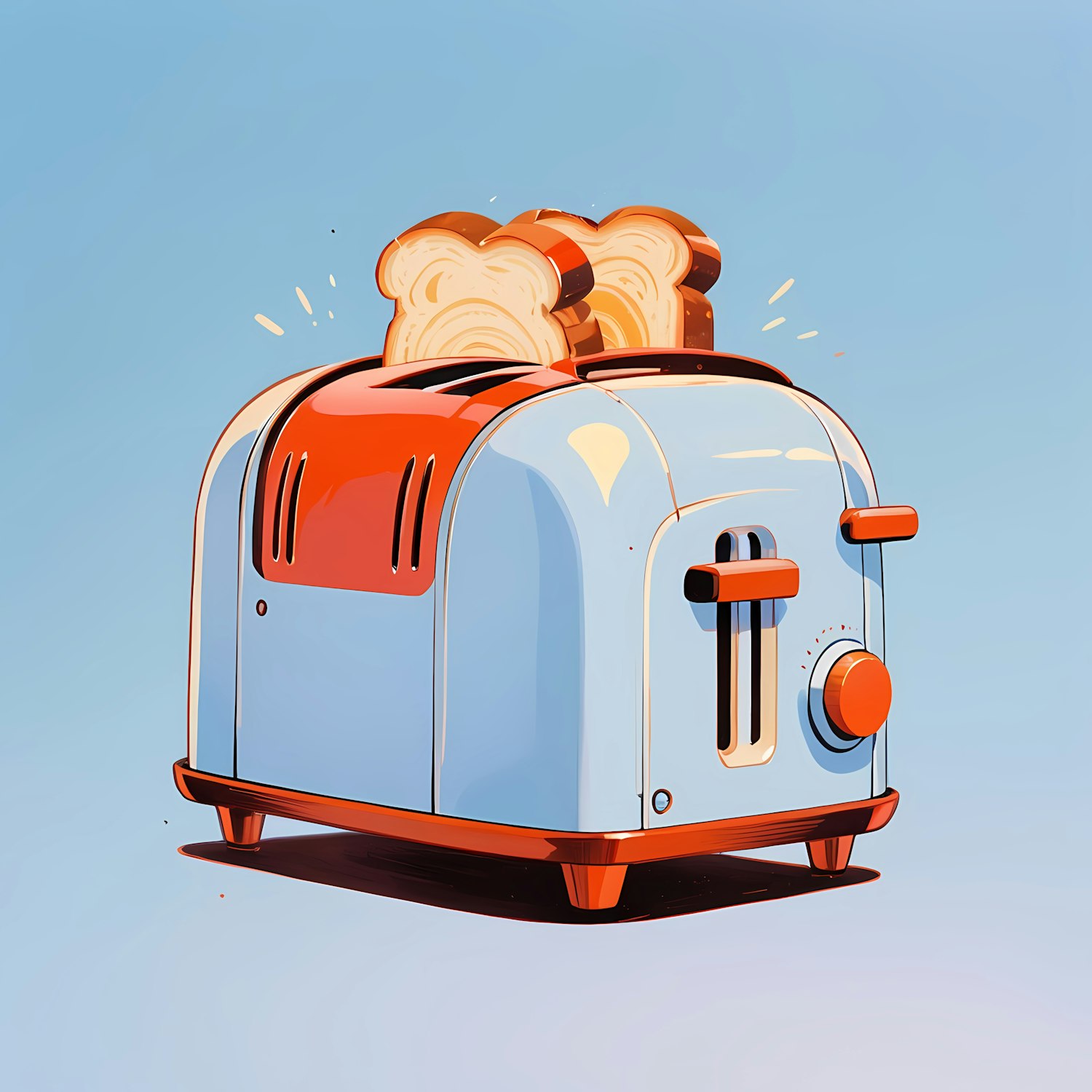 Retro-style toaster illustration with blue and red accents, golden toast popping out, and a clean blue background. Perfect vintage vibe!