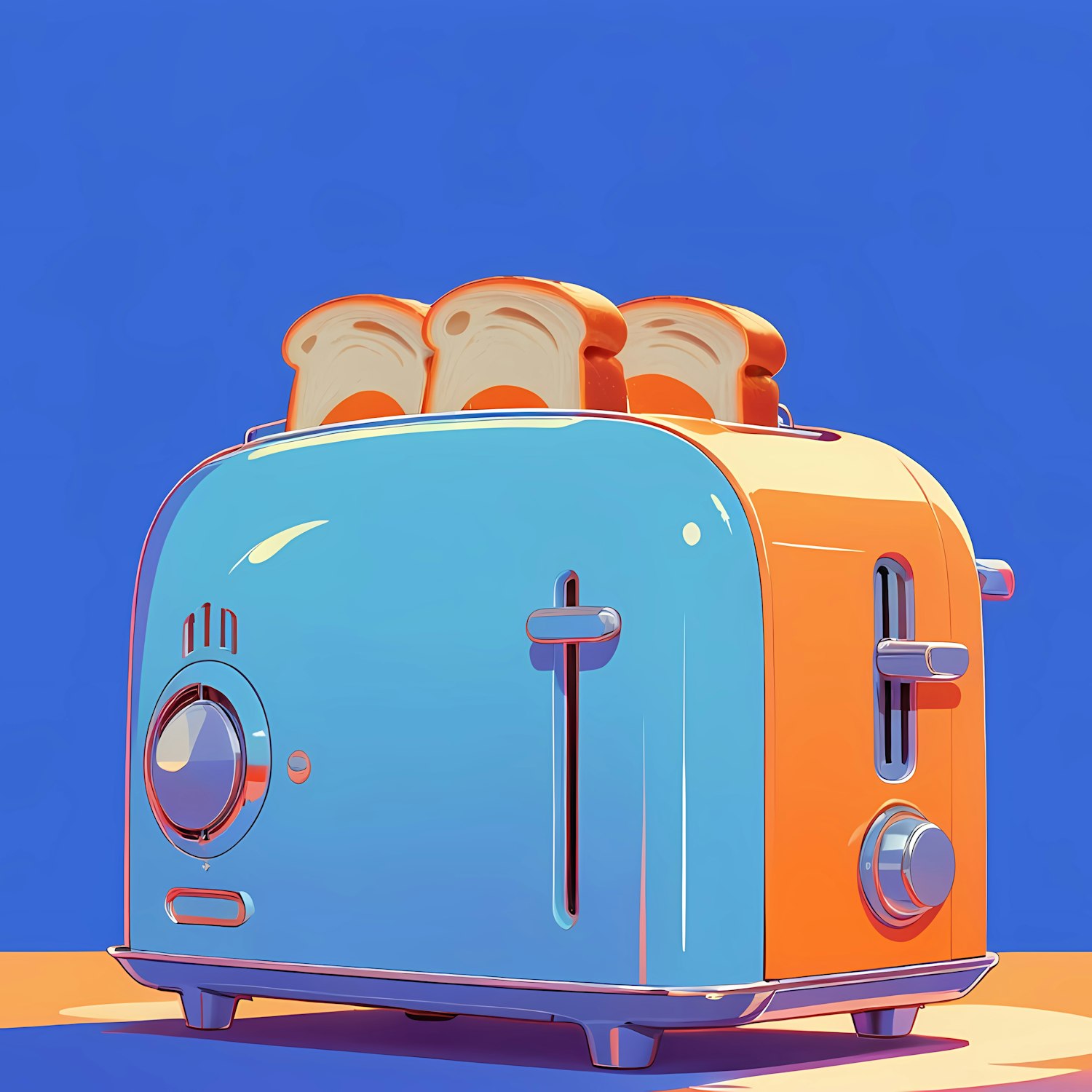 Colorful retro-style toaster illustration with blue and orange hues, featuring four slices of toasted bread against a bright blue background.