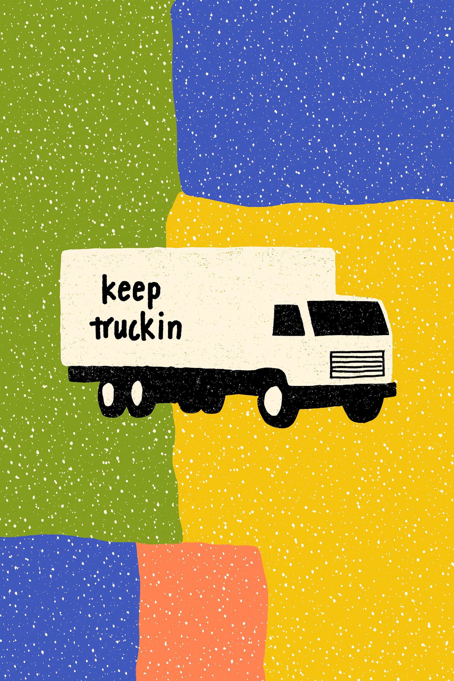 Colorful retro-style illustration of a truck with 'keep truckin' text, set against a speckled multicolored background.