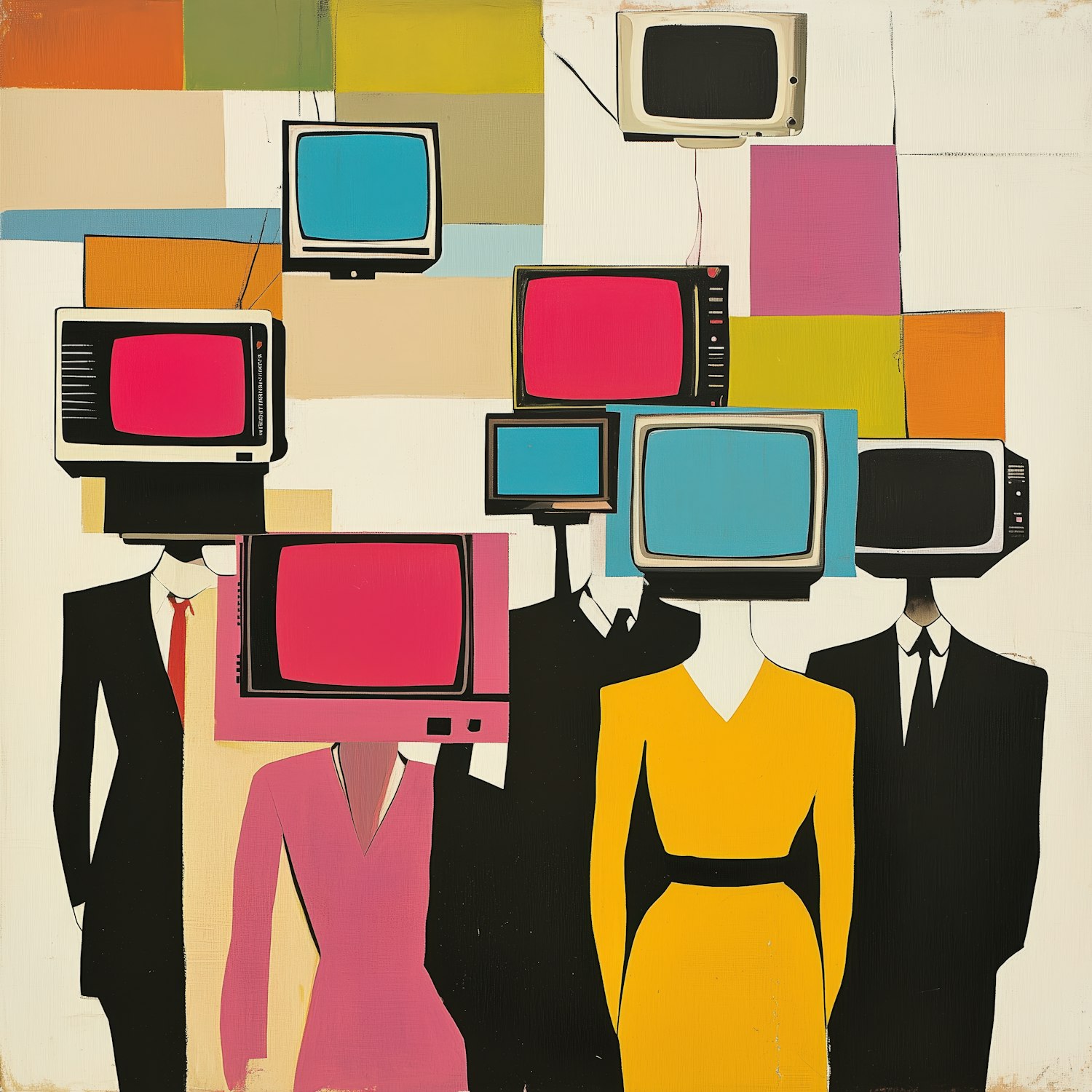 Surreal illustration of people in formal attire with retro TV heads, vibrant colors, and abstract geometric background.