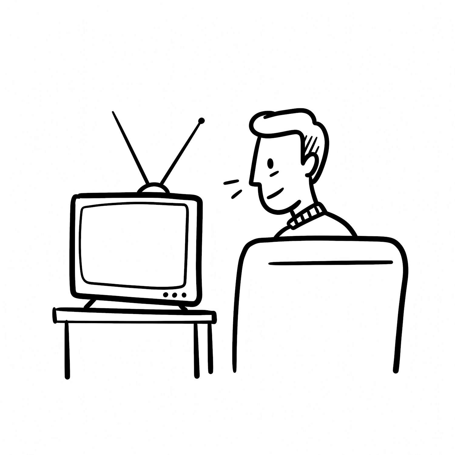 Minimalist black-and-white illustration of a person watching a retro TV with an antenna, evoking a nostalgic and simple aesthetic.