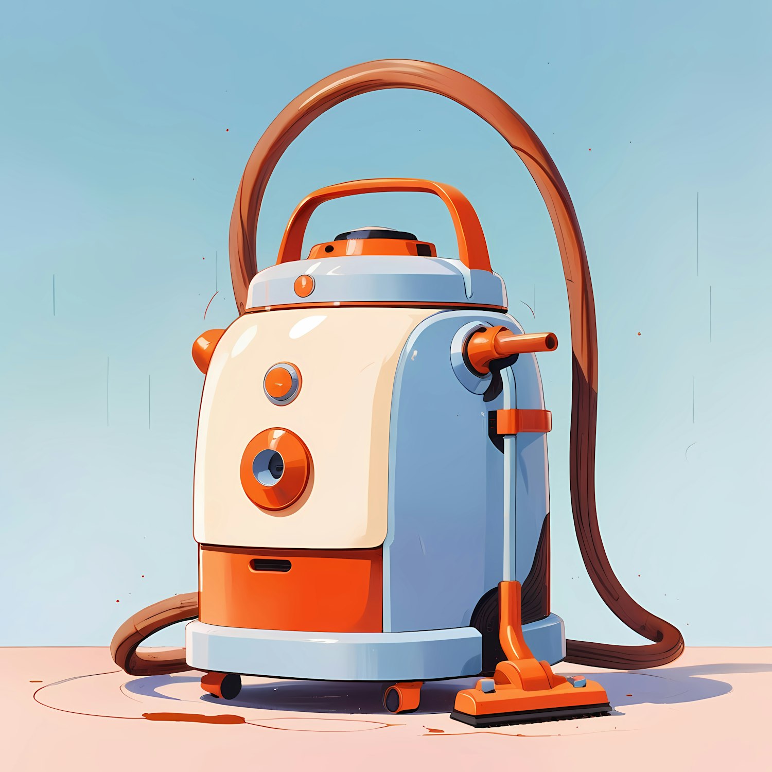 Retro-styled vacuum cleaner illustration with cream, orange, and blue tones, set on a pink surface with a light blue background.