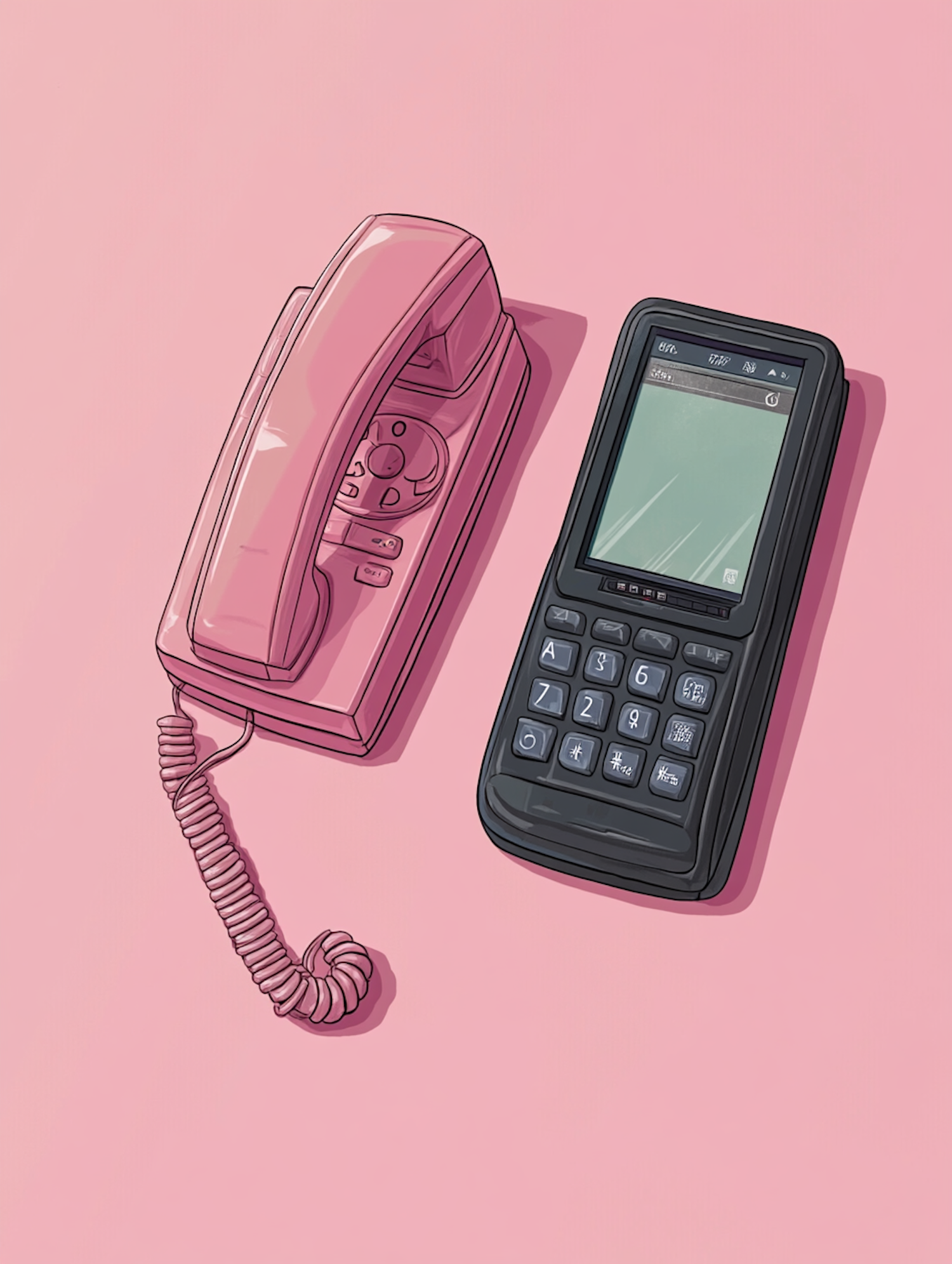 A retro pink corded phone and a black keypad mobile phone on a pastel pink background, showcasing the evolution of communication devices.