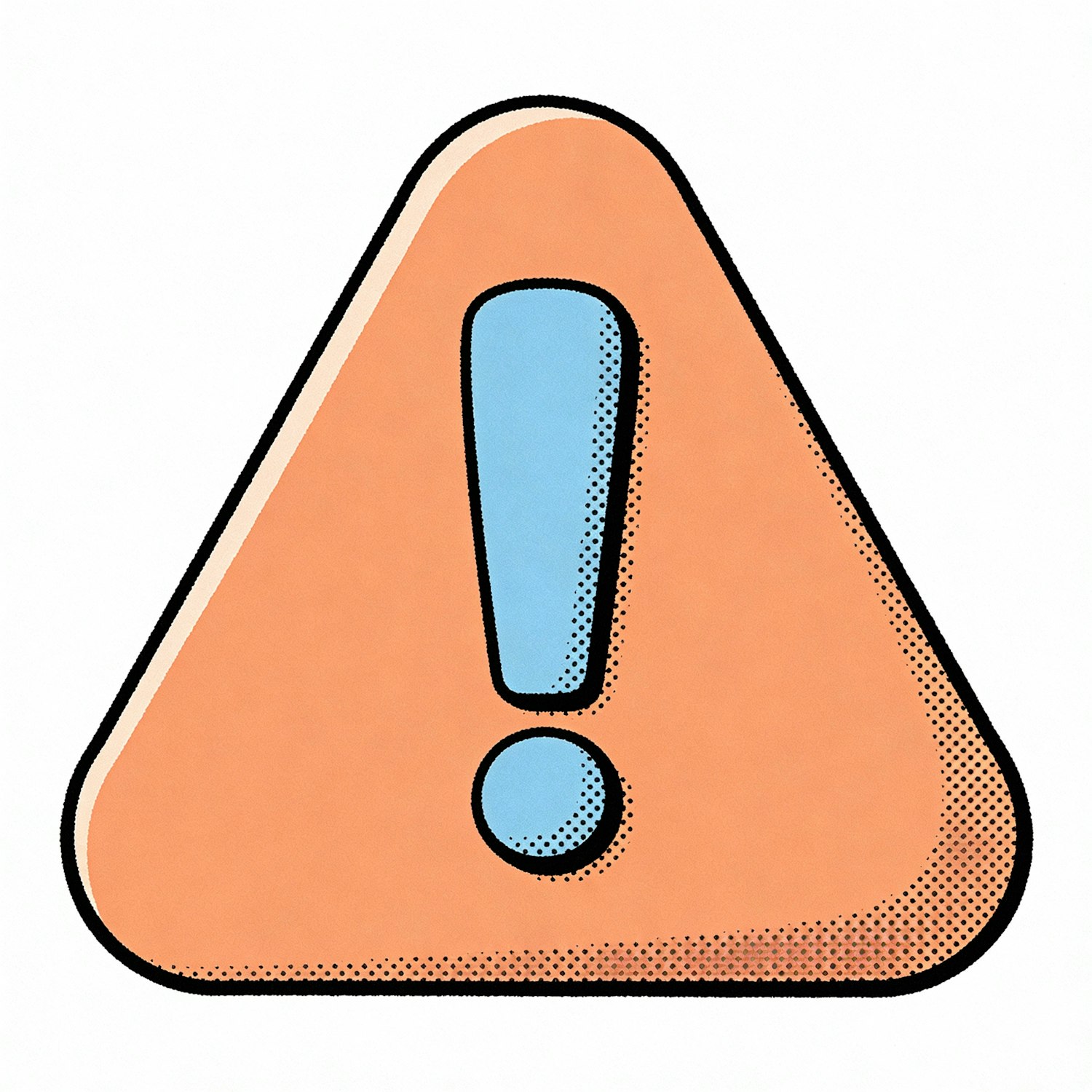 A retro-styled warning sign illustration with an orange triangle and blue exclamation mark, featuring a halftone texture on a white background.