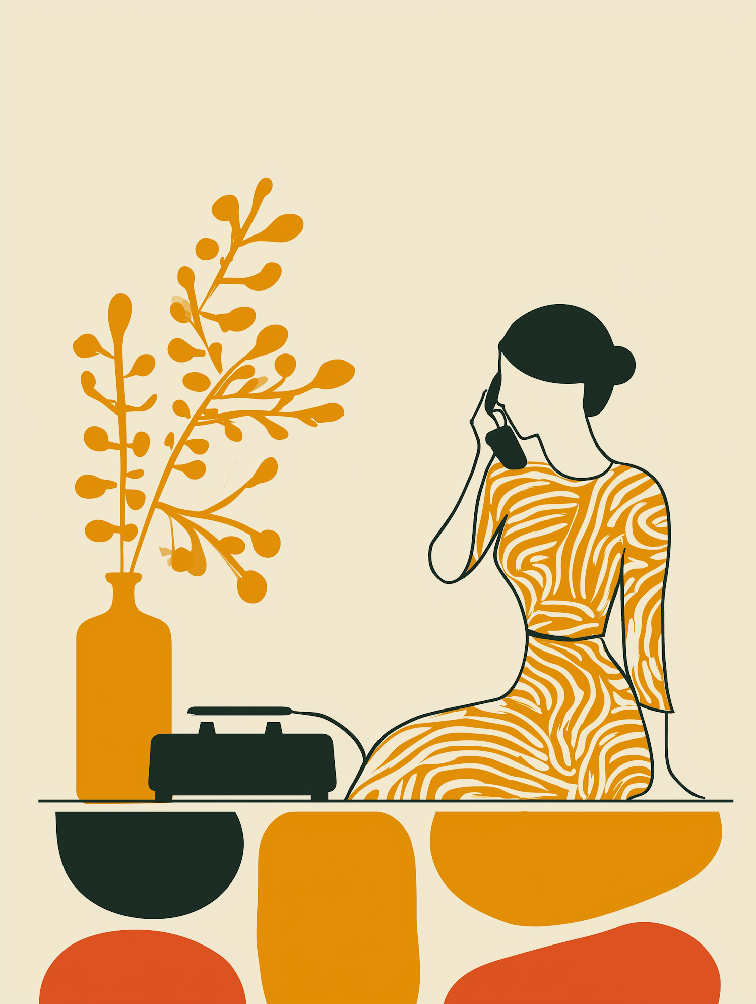 Minimalist retro-style illustration of a woman in a patterned dress on the phone, with a vase and rotary phone on a colorful surface.