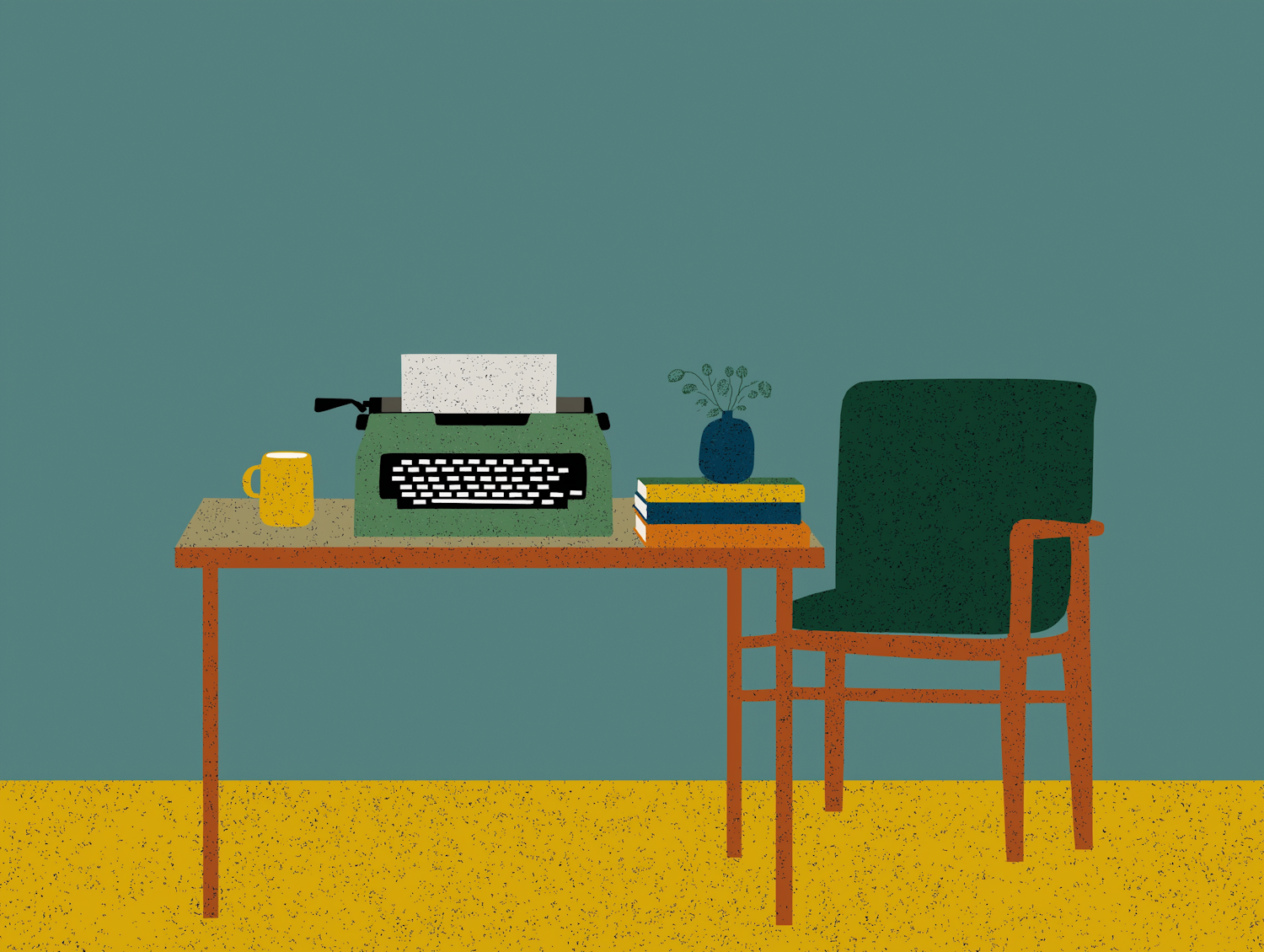 Minimalist illustration of a retro workspace with a typewriter, books, and a plant on a wooden desk, paired with a green-cushioned chair.
