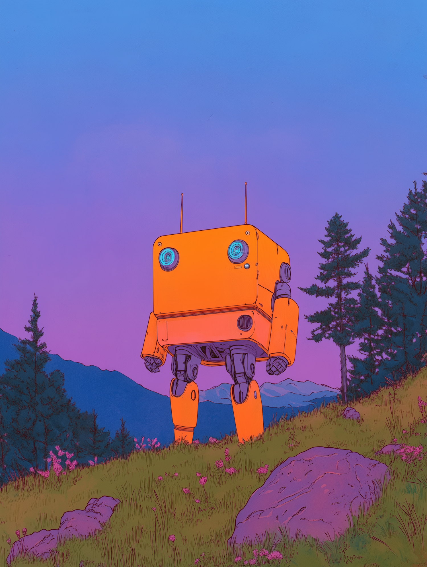 A whimsical orange robot stands on a grassy hill with a serene mountain backdrop under a gradient sky.