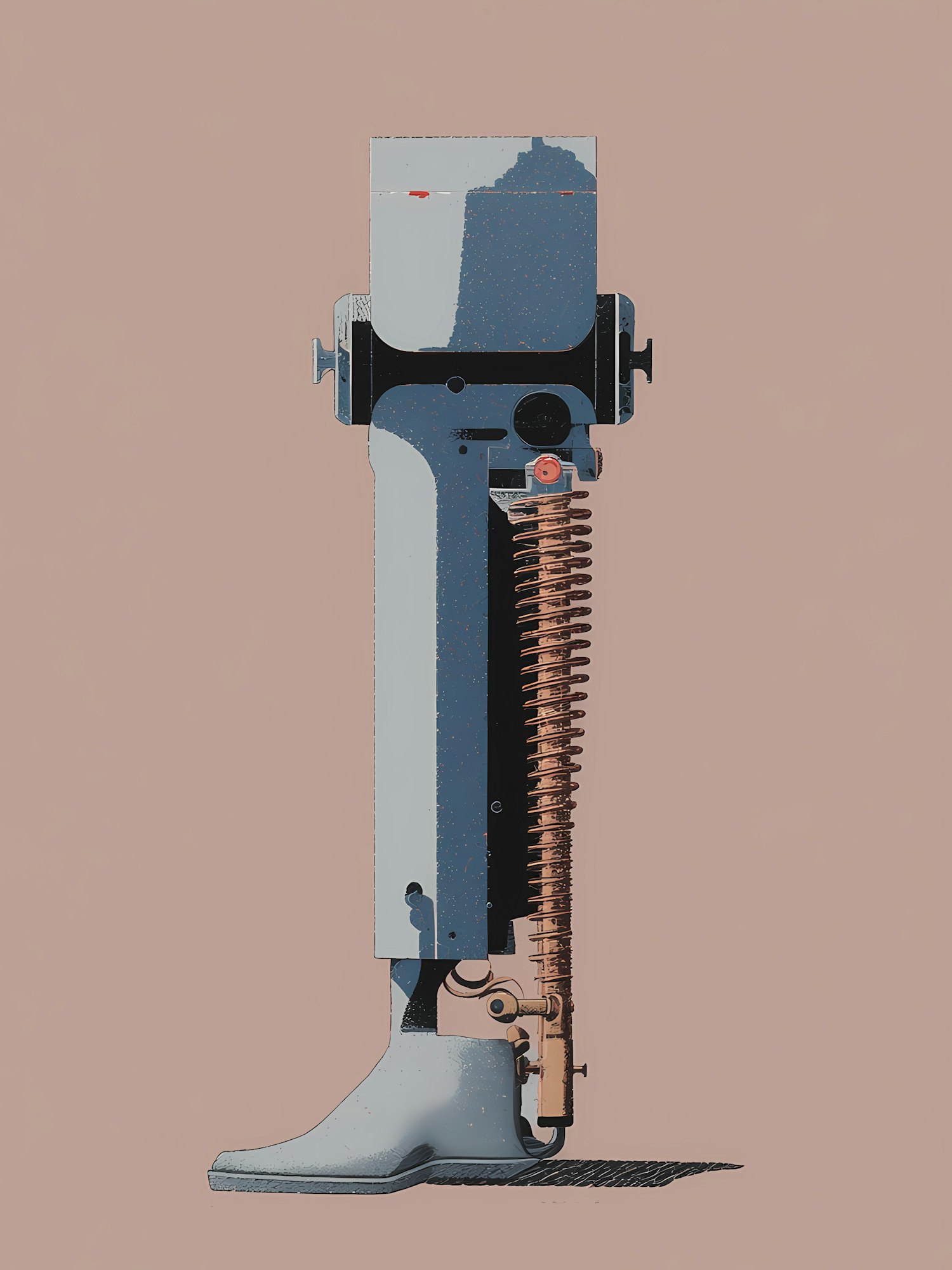 Stylized illustration of a robotic leg or prosthetic limb with industrial design elements and a muted color palette.