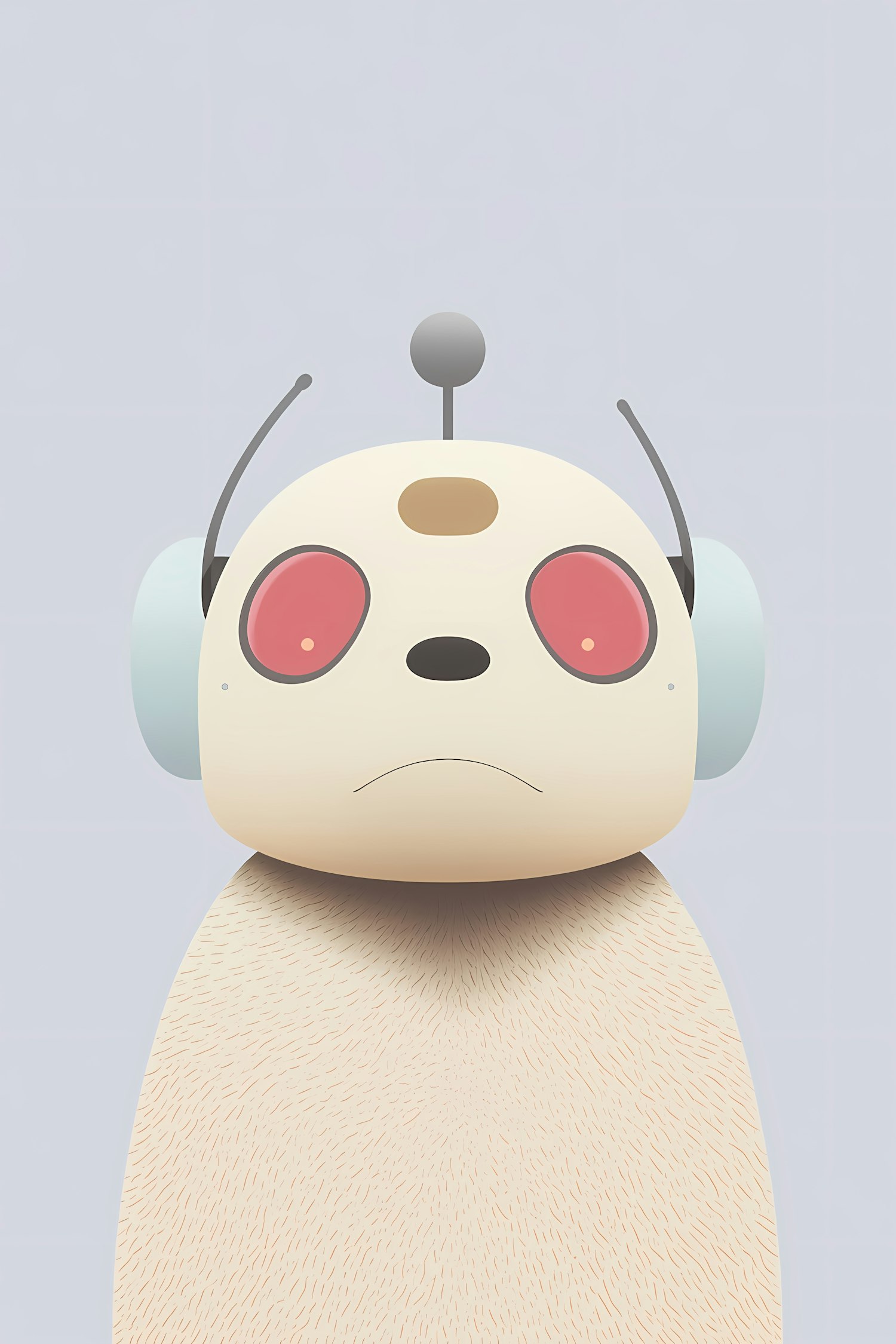 A cute robotic panda illustration with red eyes, an antenna, and headphones, set against a light gray background.