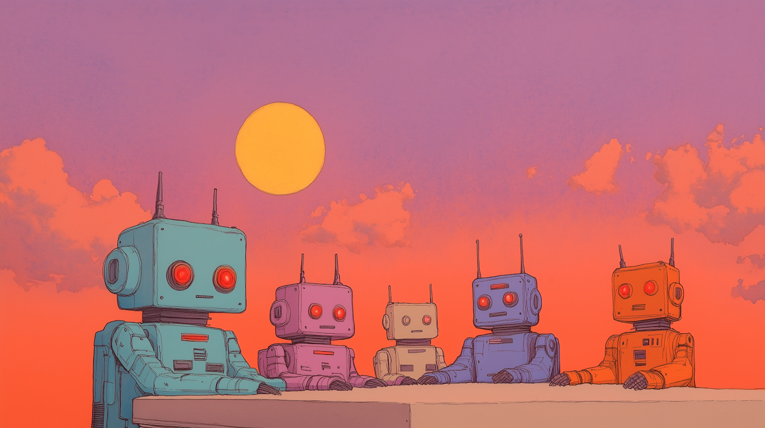 Five retro robots gather at a table against a vibrant sunset, featuring glowing red eyes and colorful designs.