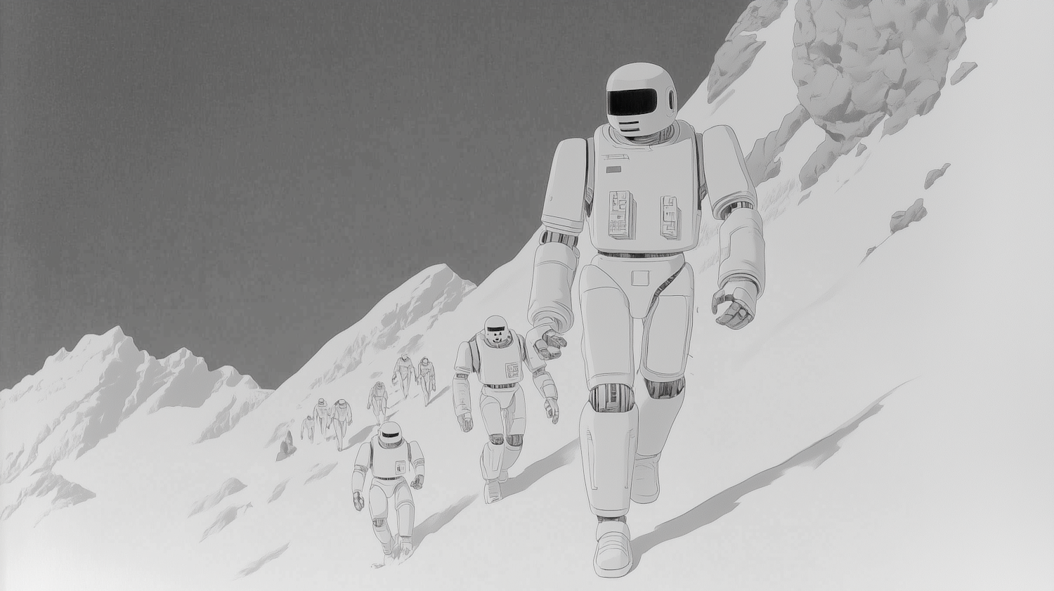 Humanoid robots trek up a snowy mountain, showcasing futuristic exploration in a monochromatic landscape.
