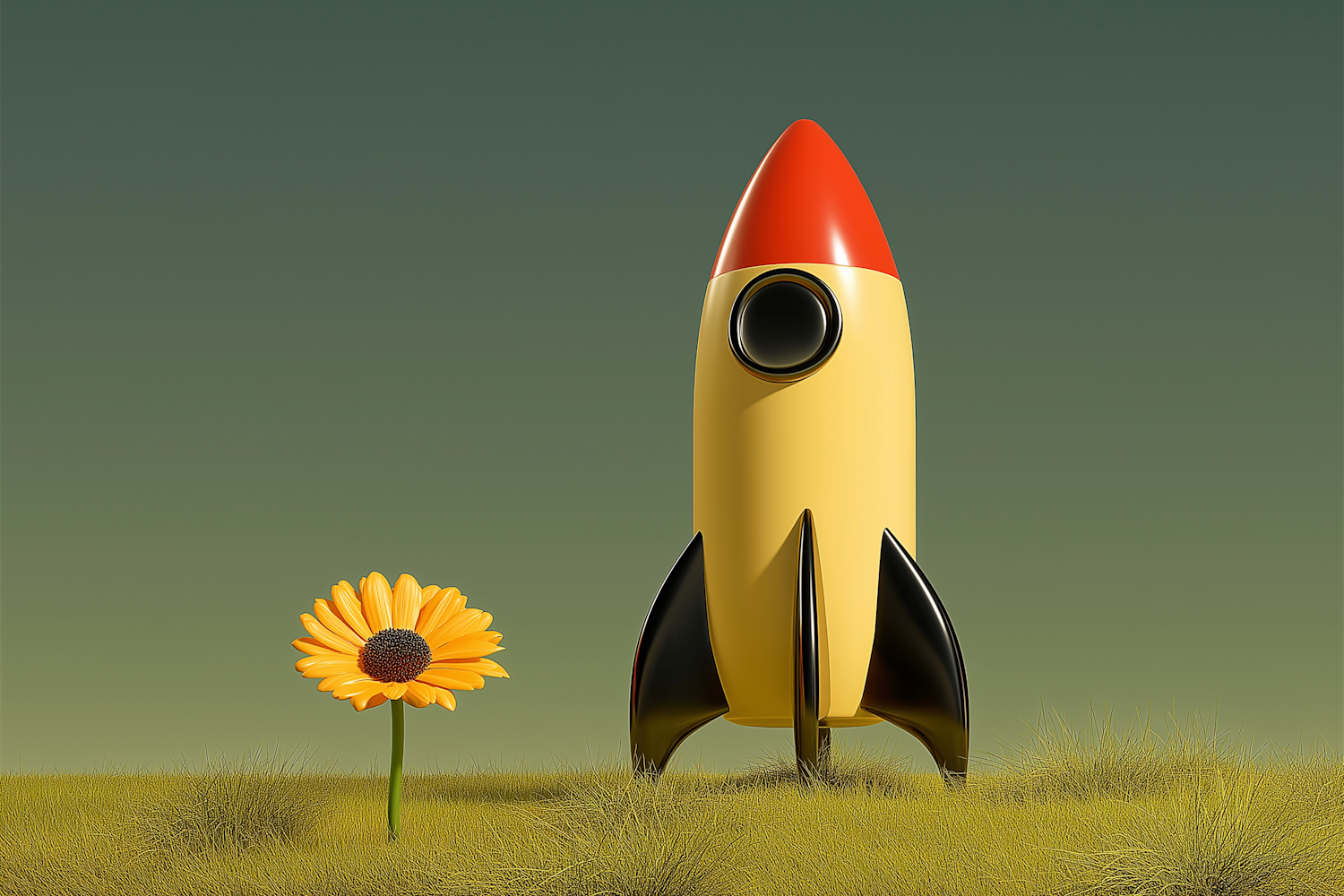 A playful illustration of a yellow rocket and a sunflower on a grassy field with a surreal green background. Nature meets technology!