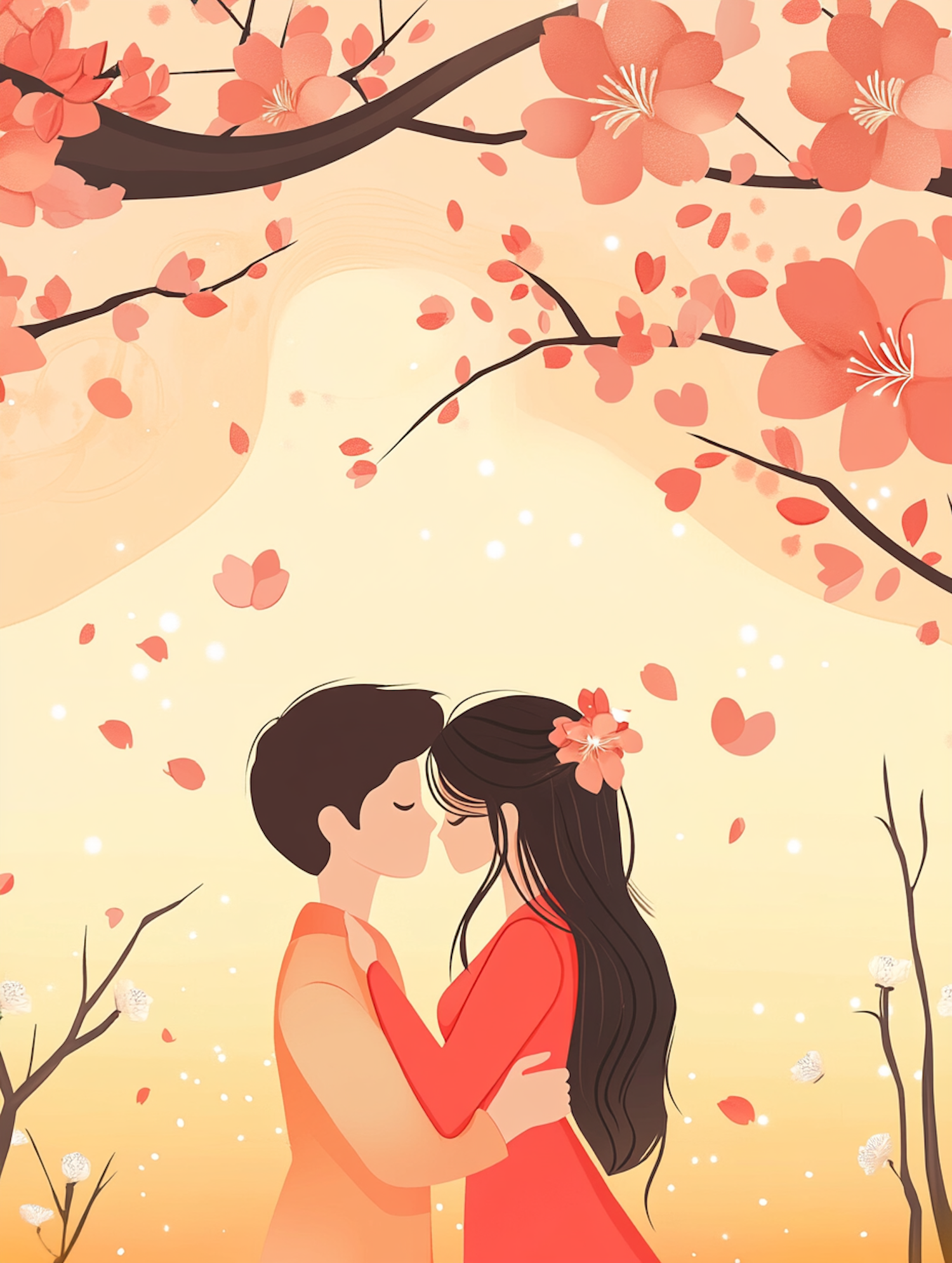 Romantic illustration of a couple embracing under cherry blossoms, surrounded by falling petals in warm peach and pink hues.