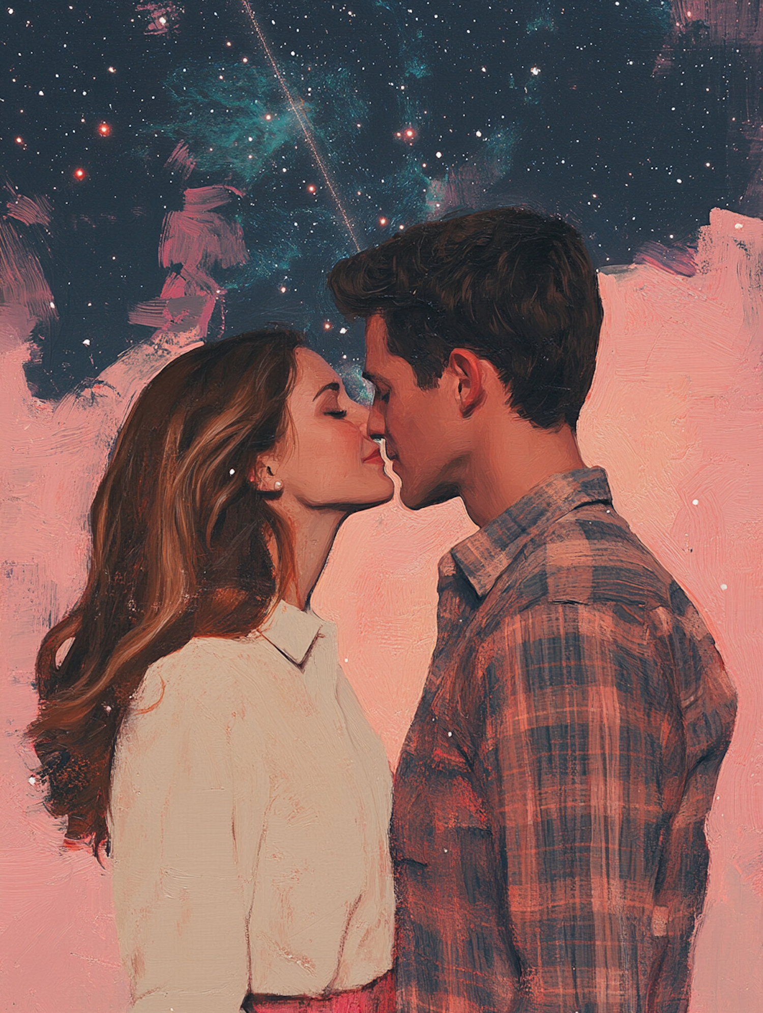Romantic illustration of a couple about to kiss under a starry night sky, with dreamy blue and pink hues.