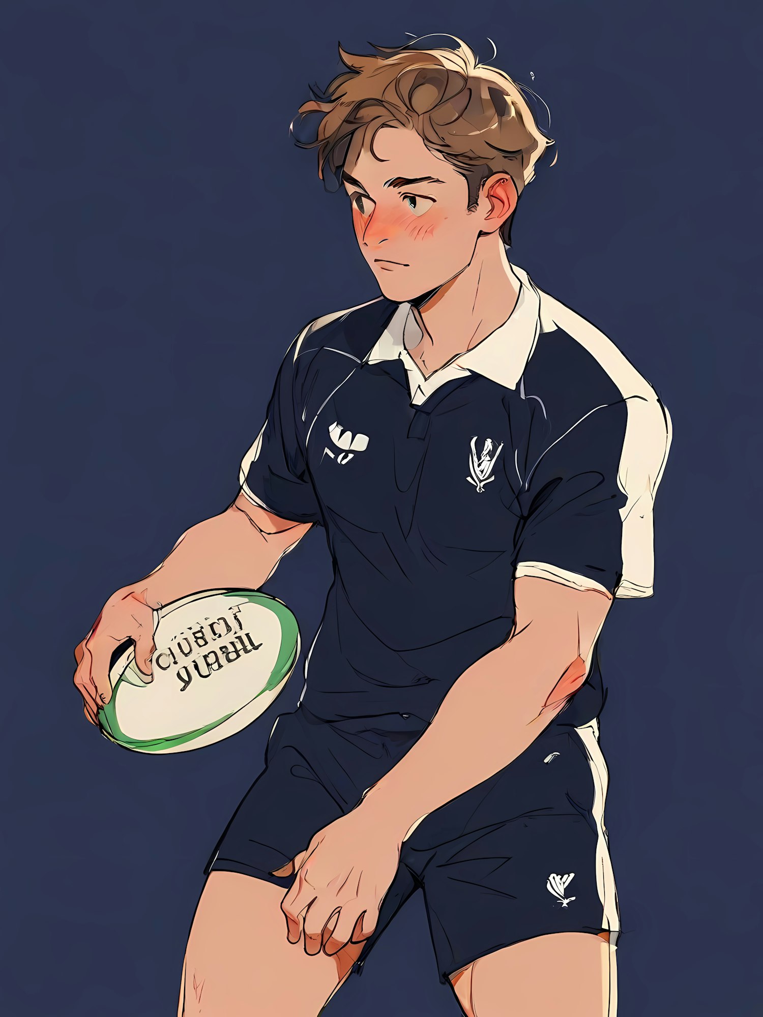 Stylized illustration of a young rugby player in a navy uniform holding a rugby ball, with a focused expression and a solid blue background.