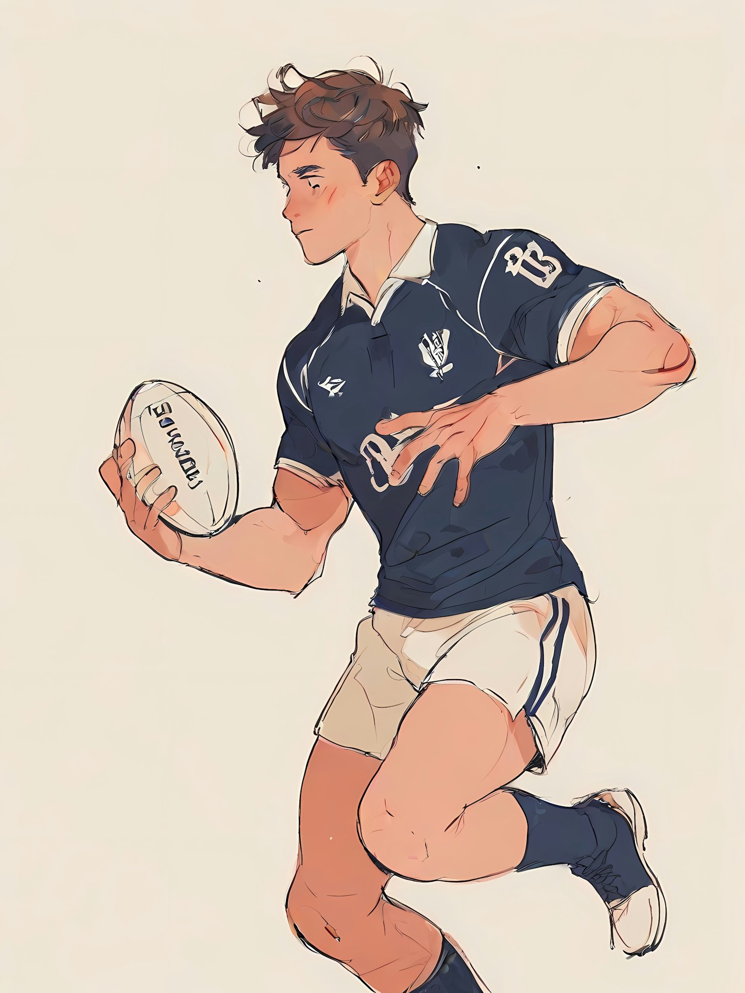 Dynamic illustration of a rugby player in action, wearing a navy jersey and white shorts, holding a rugby ball mid-motion.