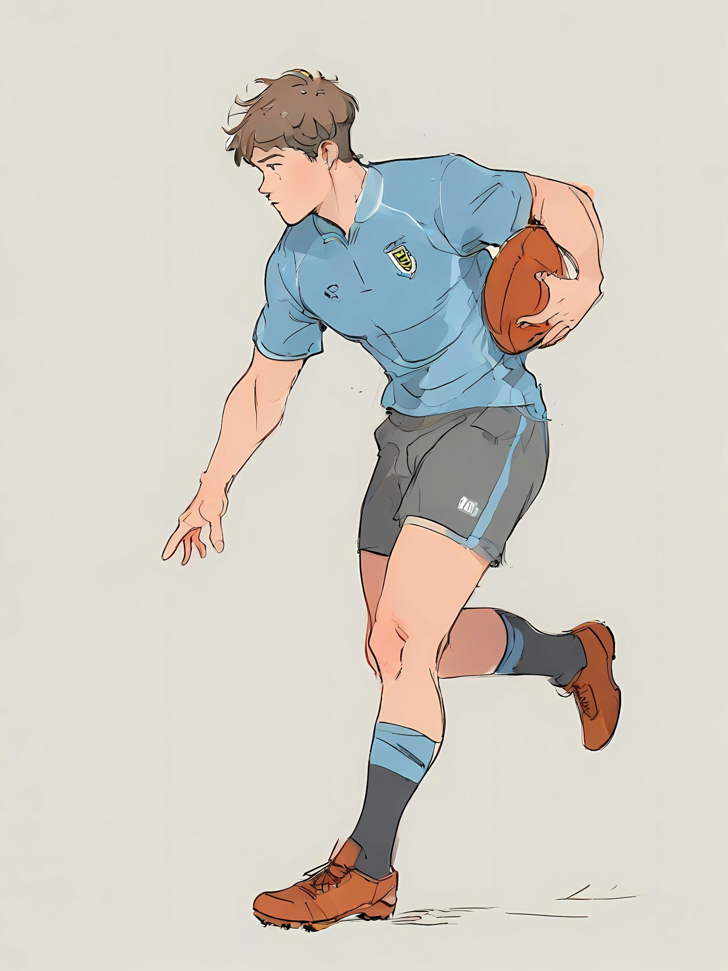 Dynamic illustration of a rugby player in a light blue jersey, running with a rugby ball. Perfect for sports-themed designs or rugby fans.