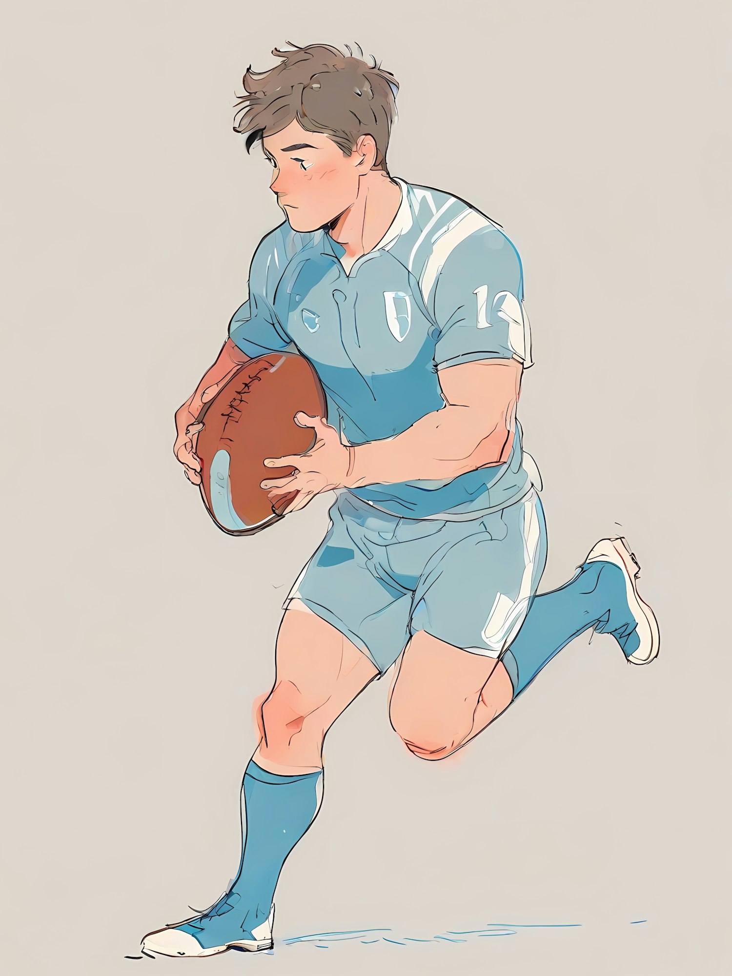 Stylized illustration of a rugby player in a light blue uniform, running with a ball in hand. Dynamic pose and clean, minimal background.