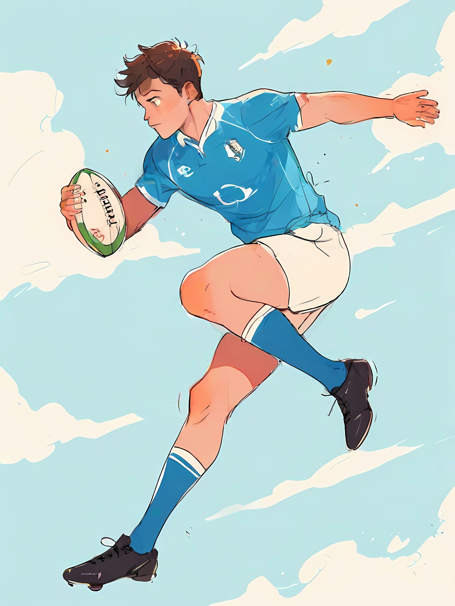 Energetic illustration of a rugby player in mid-air, holding a ball, wearing a blue jersey and white shorts against a bright sky background.