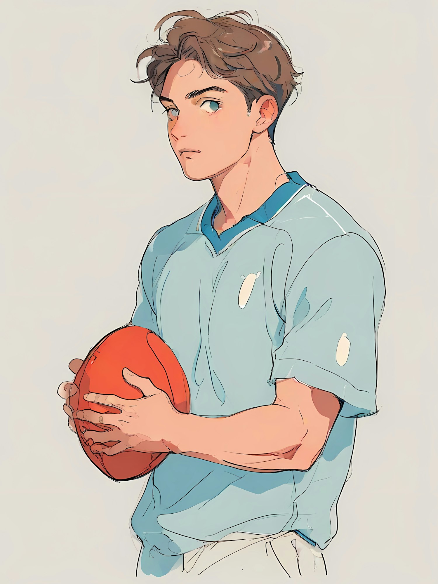 Stylized illustration of a young man with brown hair and blue-green eyes holding a rugby ball, wearing a light blue jersey.
